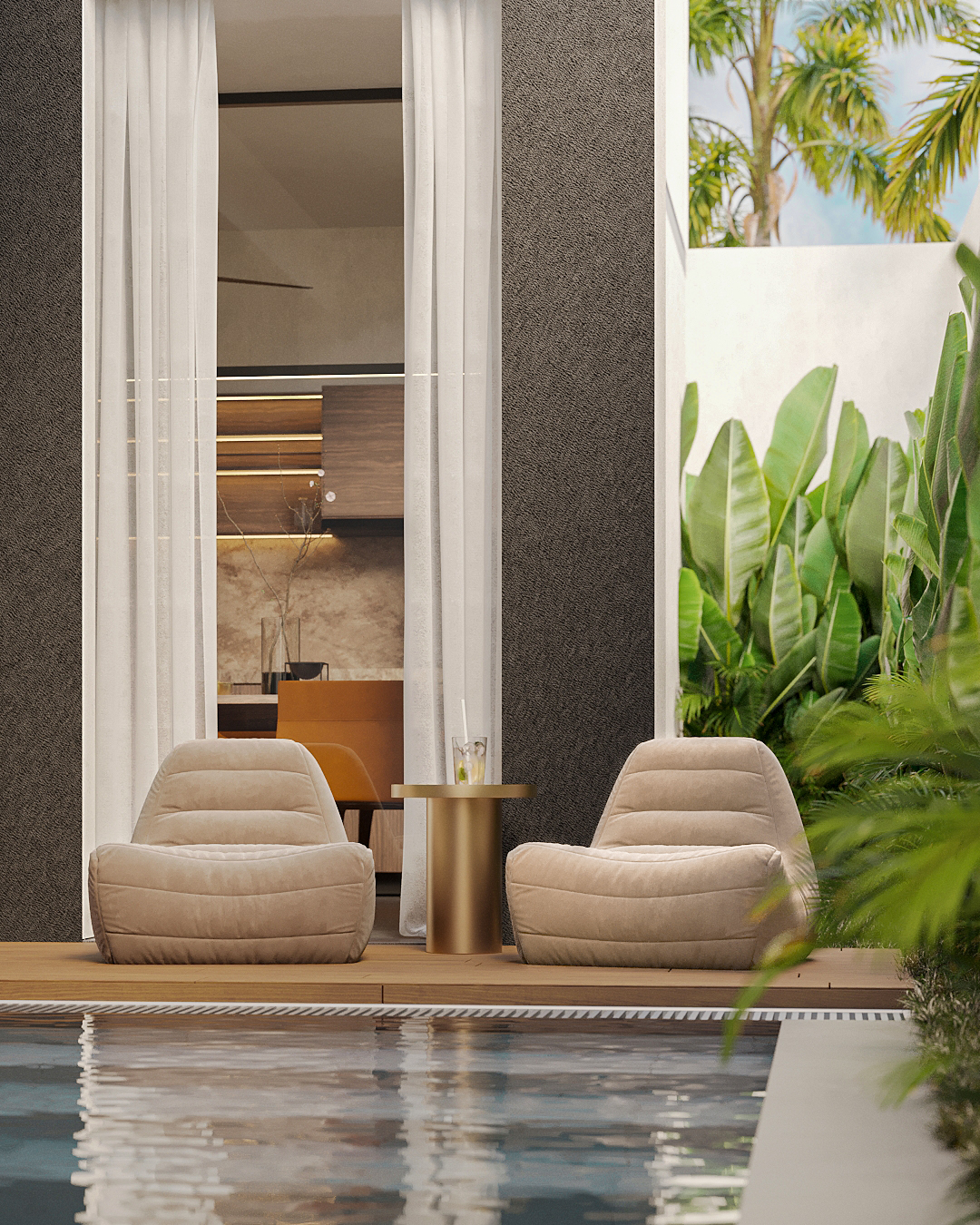 Outside, you can enjoy a sparkling pool and a stylish lounge area.Â