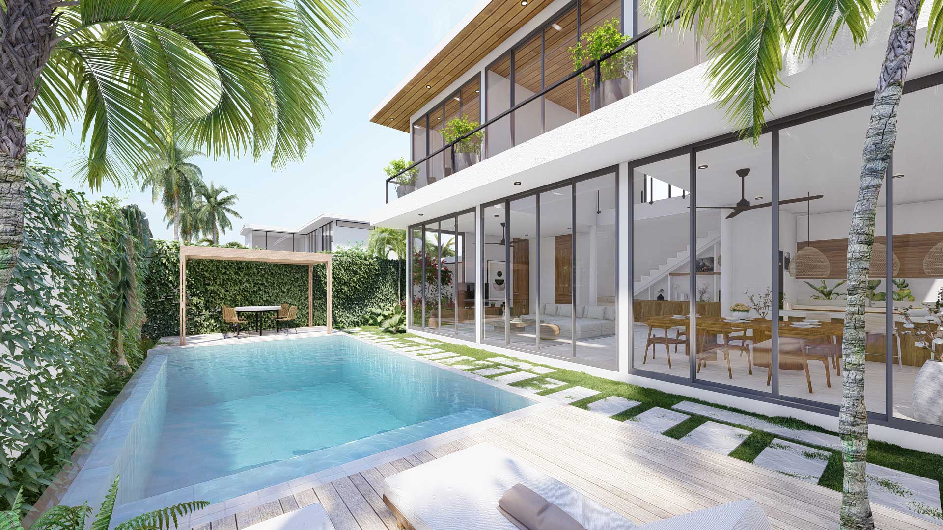 Choose your paradise with the rooftop pool featuring ocean views or the ground floor oasis surrounded by lush gardens, ensuring every moment in these lofts is a harmonious blend of relaxation and tropical elegance.