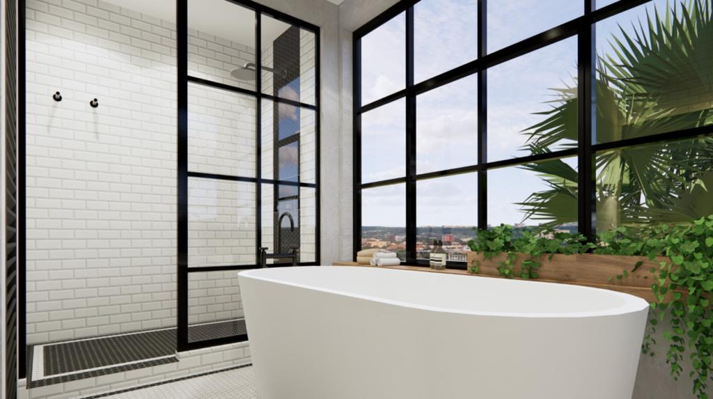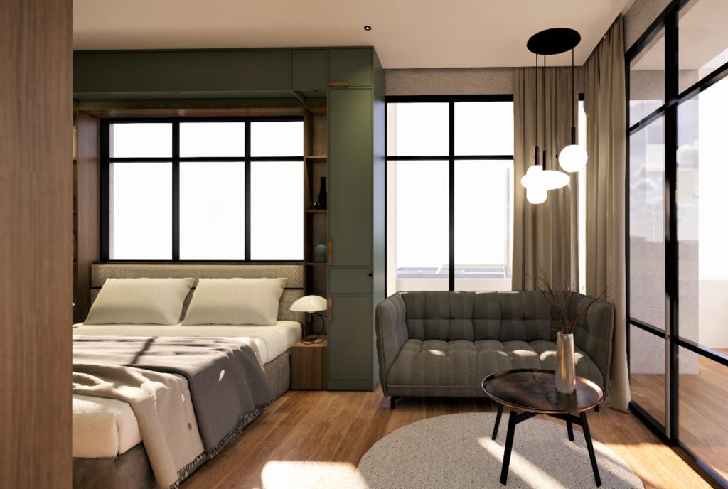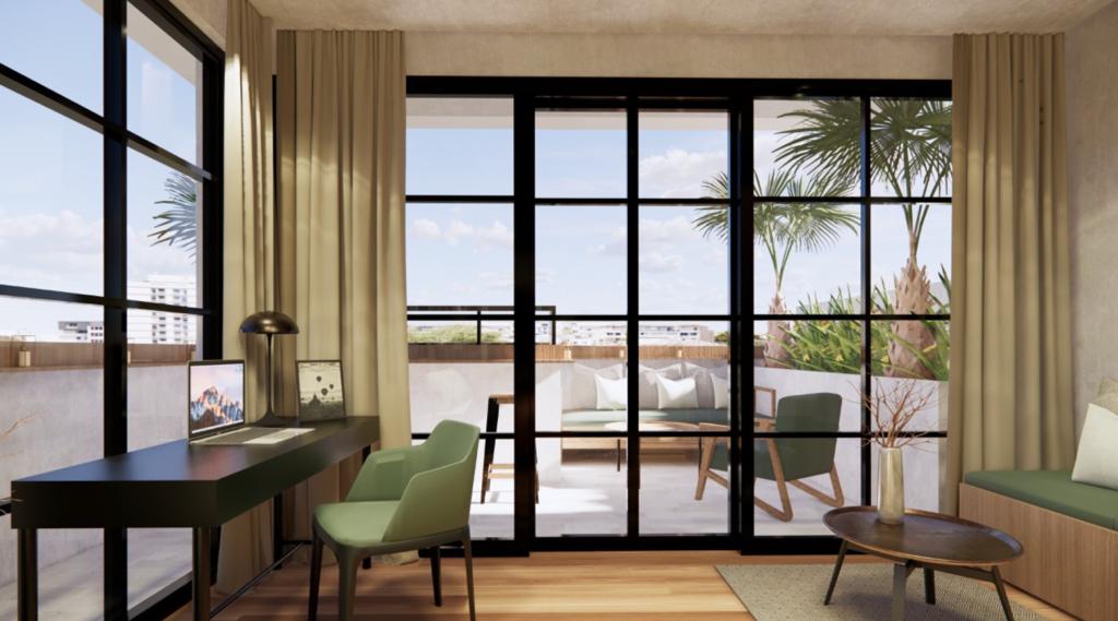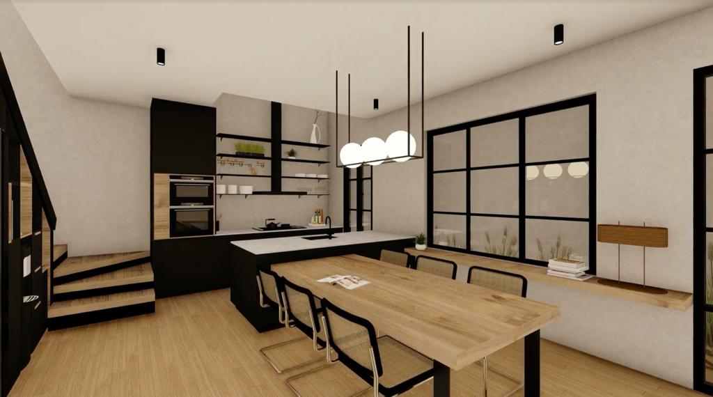 Large openings invite you to enter a voluminous living space! You’ll find a living room with comfortable sofas, an open kitchen and a dining area.