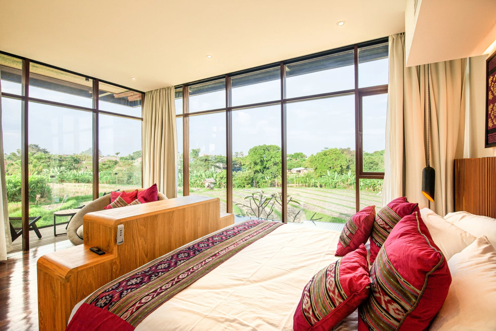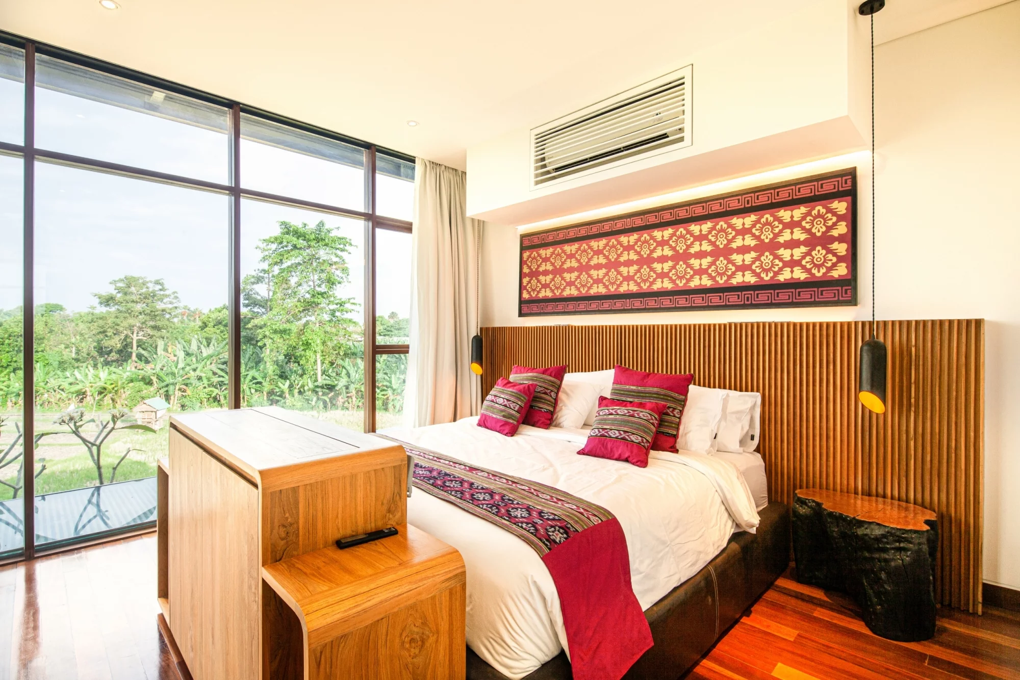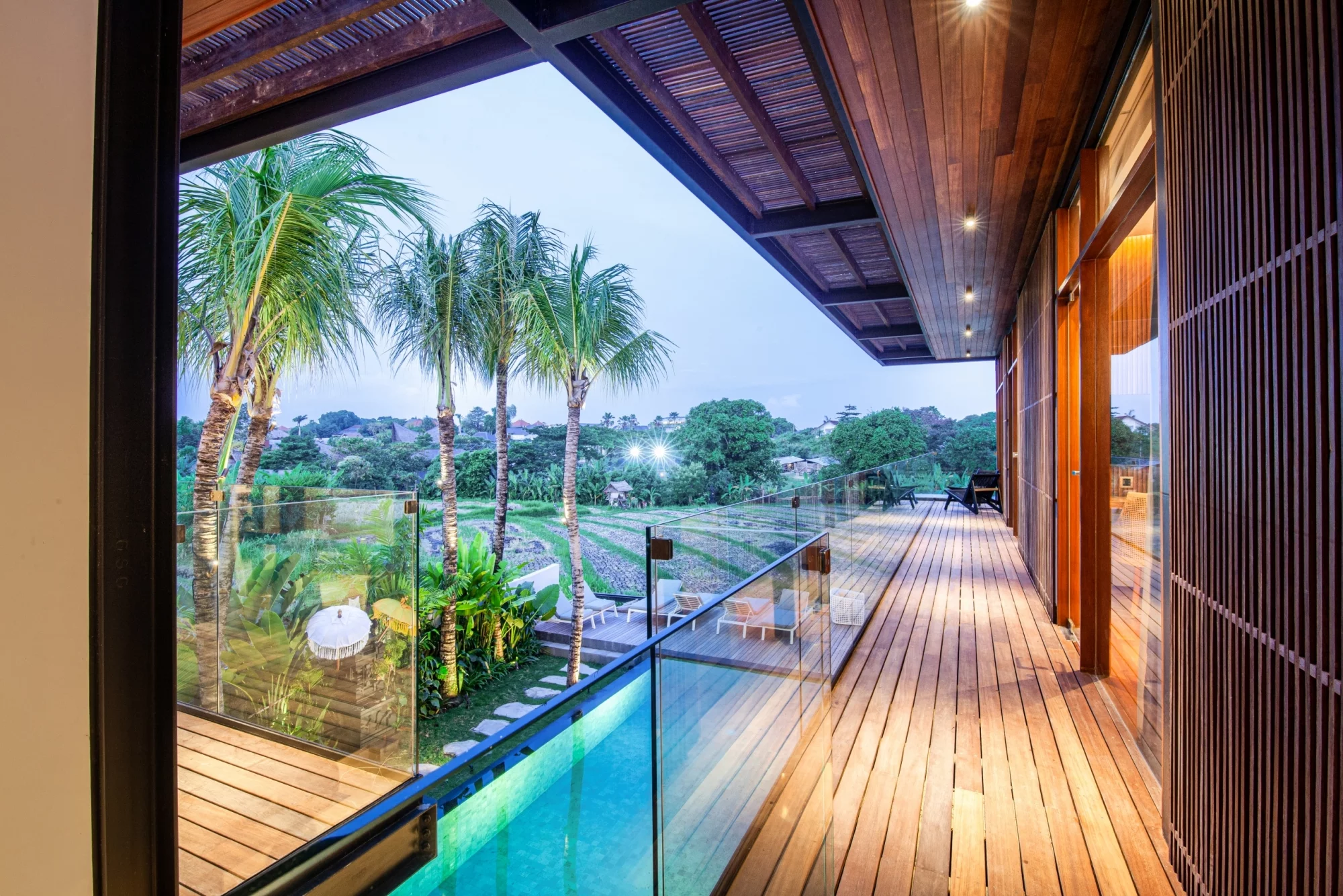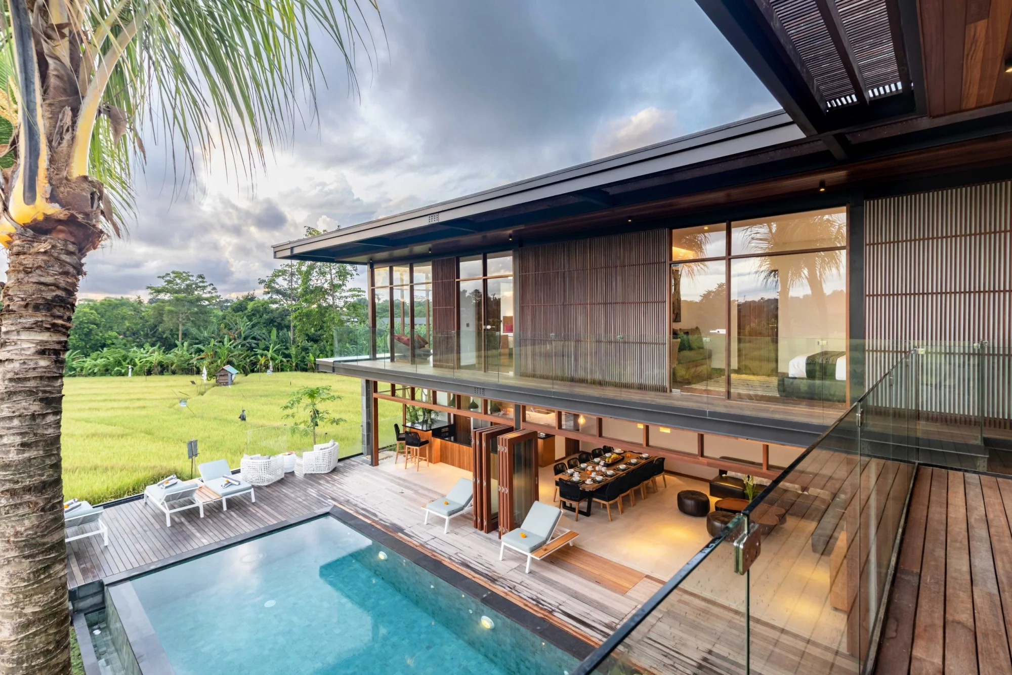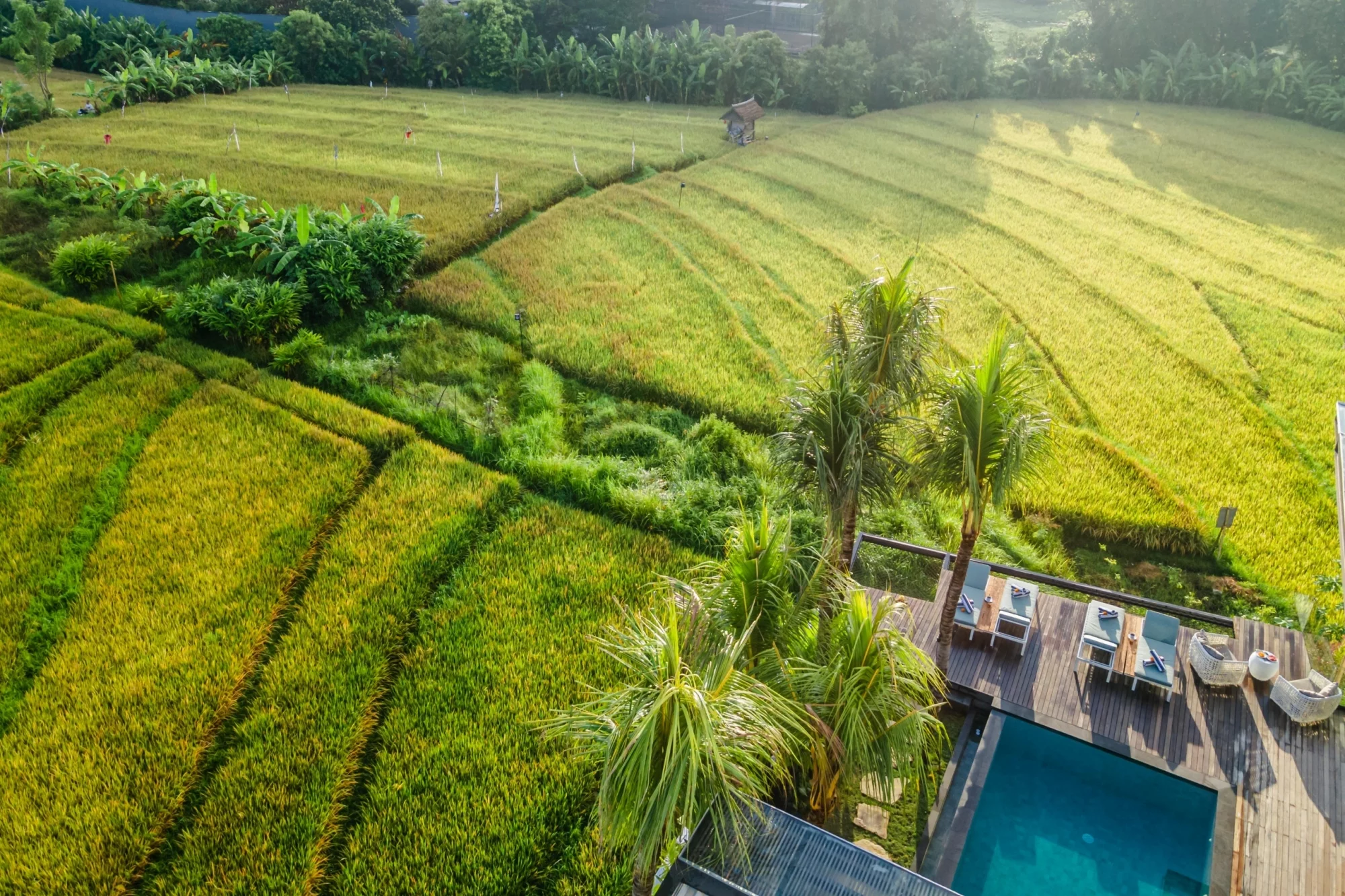The outdoor space boasts a pool and stunning views of rice fields and majestic volcanoes that are visible during sunrise and sunset. This prime location offers an unparalleled Bali experience, as the exceptional setting elevates the overall experience and creates a tranquil retreat away from the hustle and bustle of the streets.