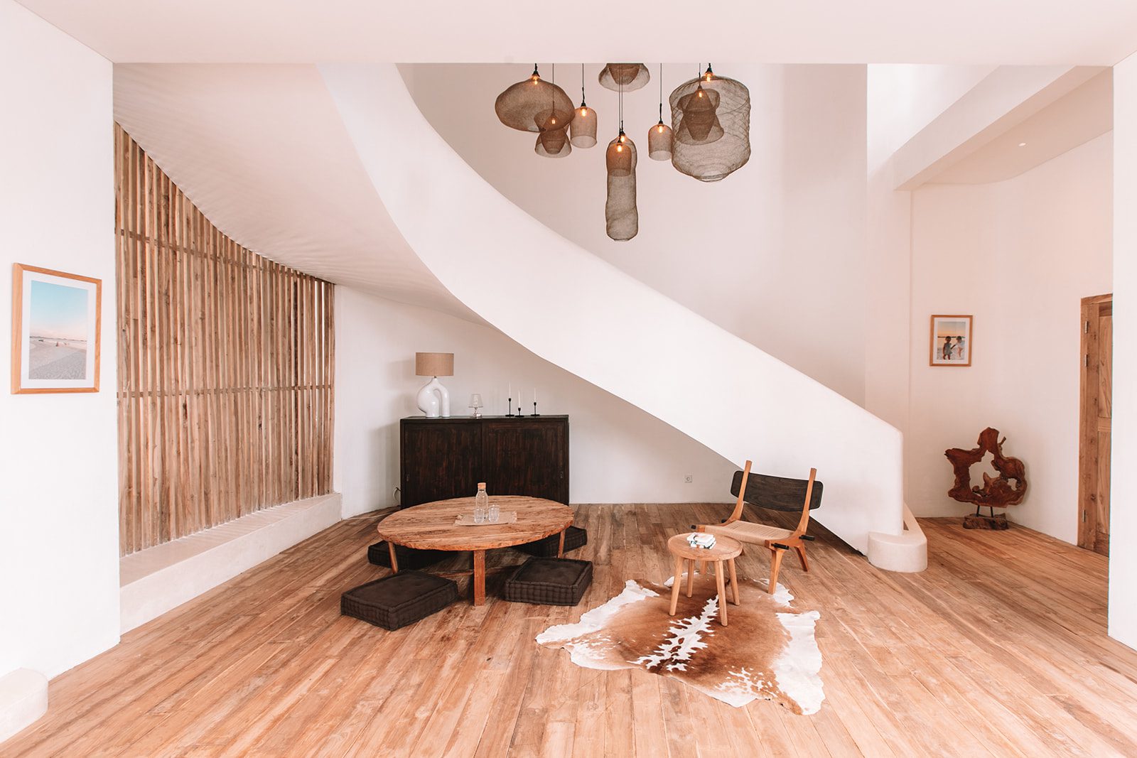 With a land area of 500 square meters and a building size of 350 square meters, this villa comprises of two floors and boasts five generously sized bedrooms, each equipped with its own private bathroom. The living area is also quite spacious, featuring large windows that bathe the room in natural light and offer picturesque views of the surrounding rice fields. The villa’s interior exudes a cozy and textured feel with its wooden furniture, which extends to both the kitchen and bedroom areas. Additionally, the white walls provide an open and well-lit ambiance.