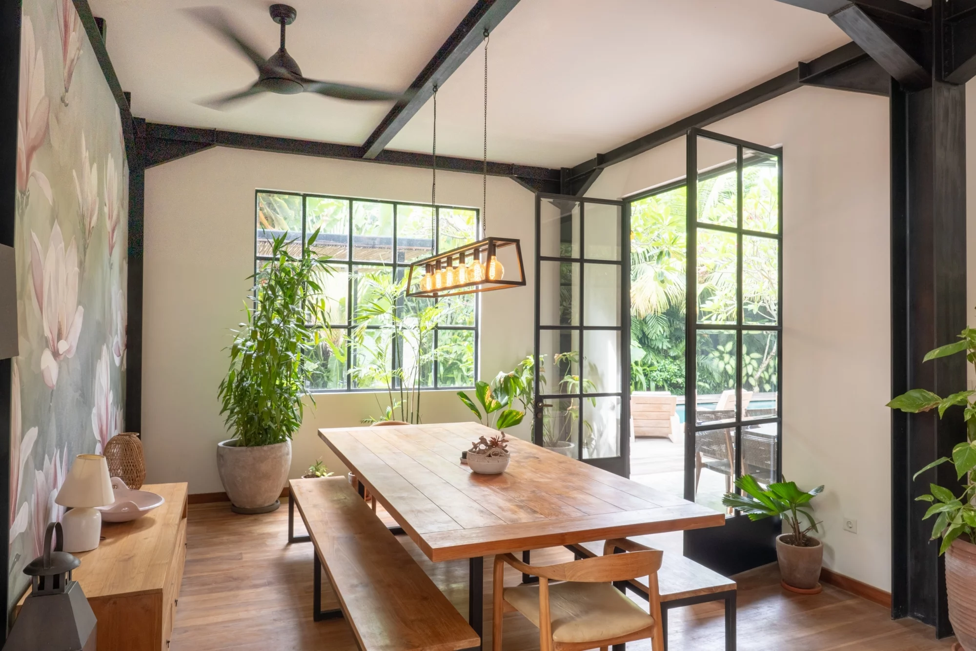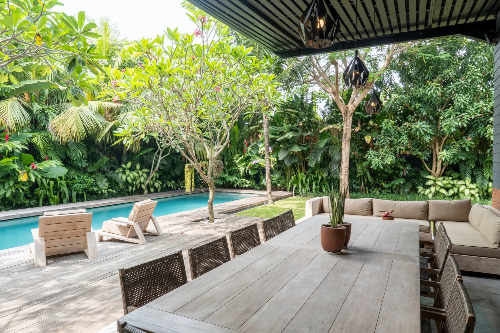 The villa’s outdoor area includes a dining room and a spacious swimming pool, both of which offer lovely views of the surrounding garden.