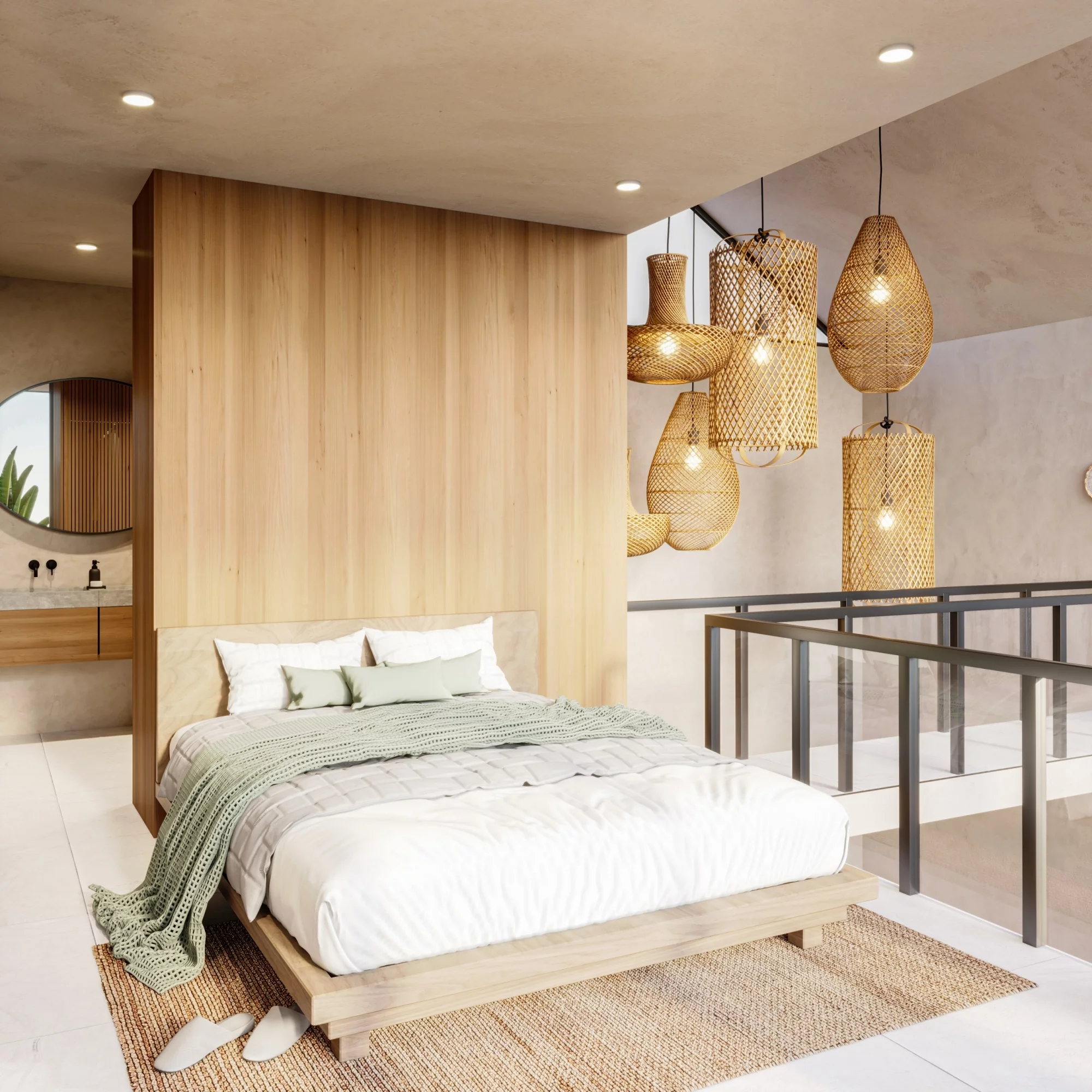 The villa features one bedroom and one bathroom, a spacious sunken living area adding a touch of luxury and sophistication to the space, a powder room is an added convenience, ensuring guests have everything they need for a comfortable stay with premium materials used throughout its construction. In addition to its other features the villa also comes with a refreshing swimming pool with a size of 16 square meters perfect place to unwind and enjoy your stay in Bali.