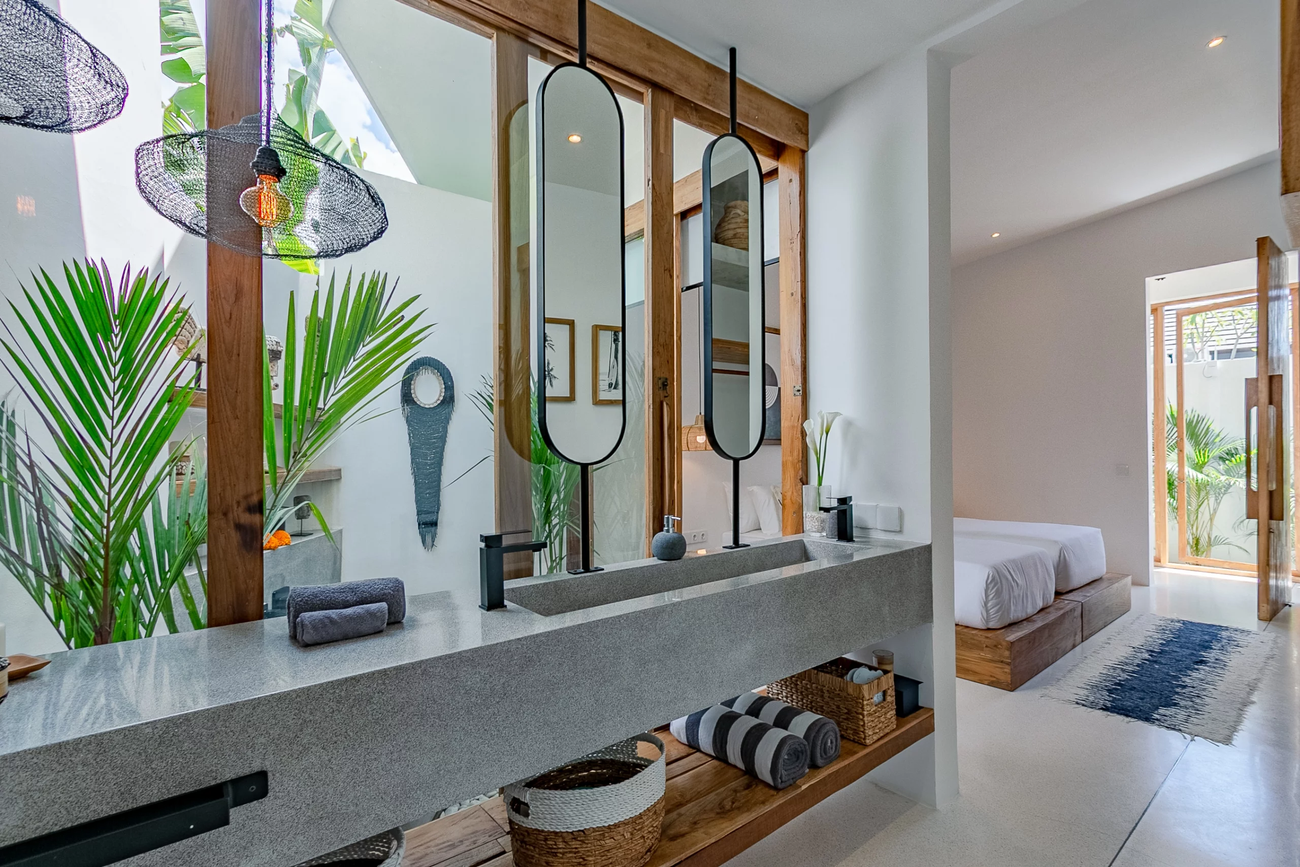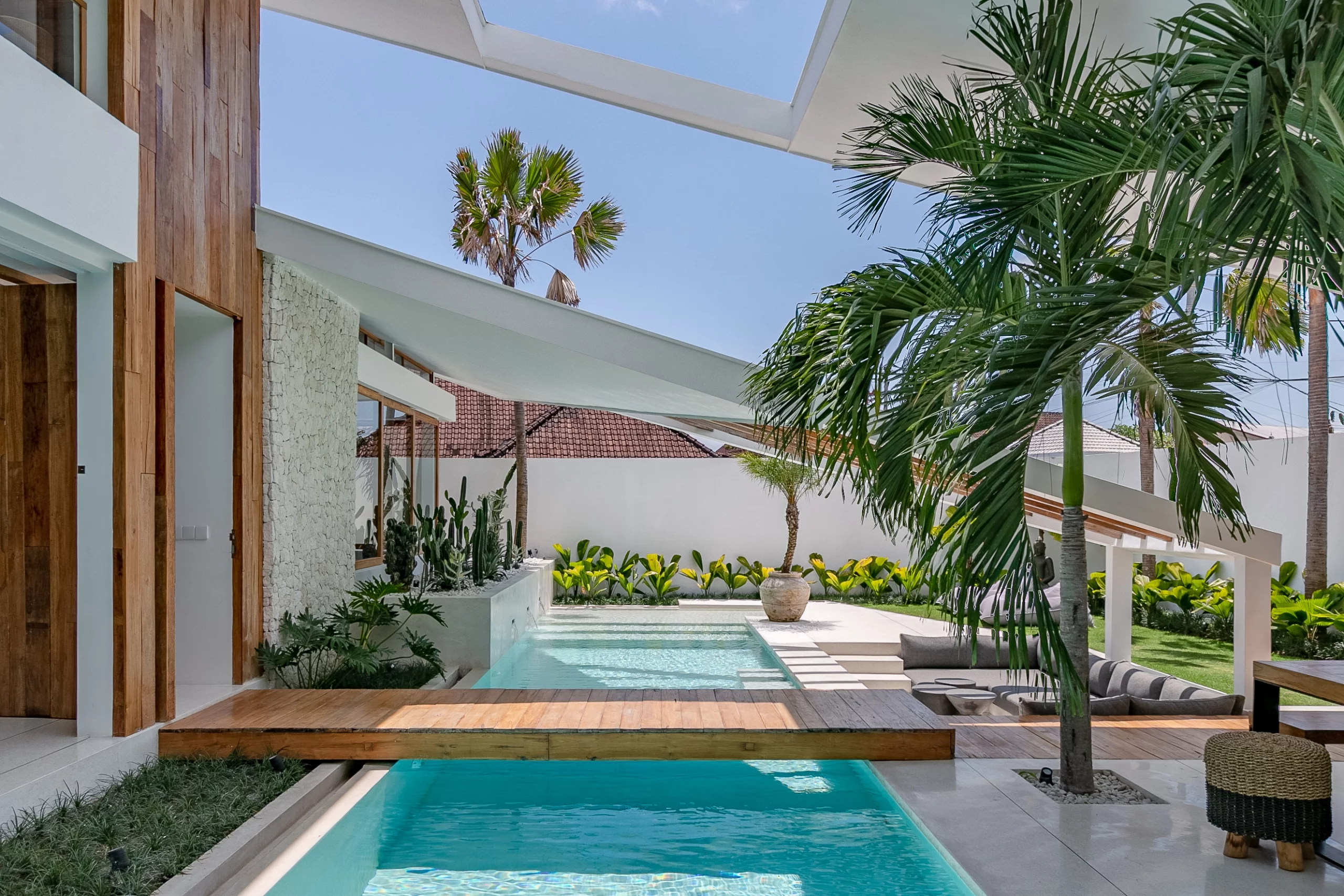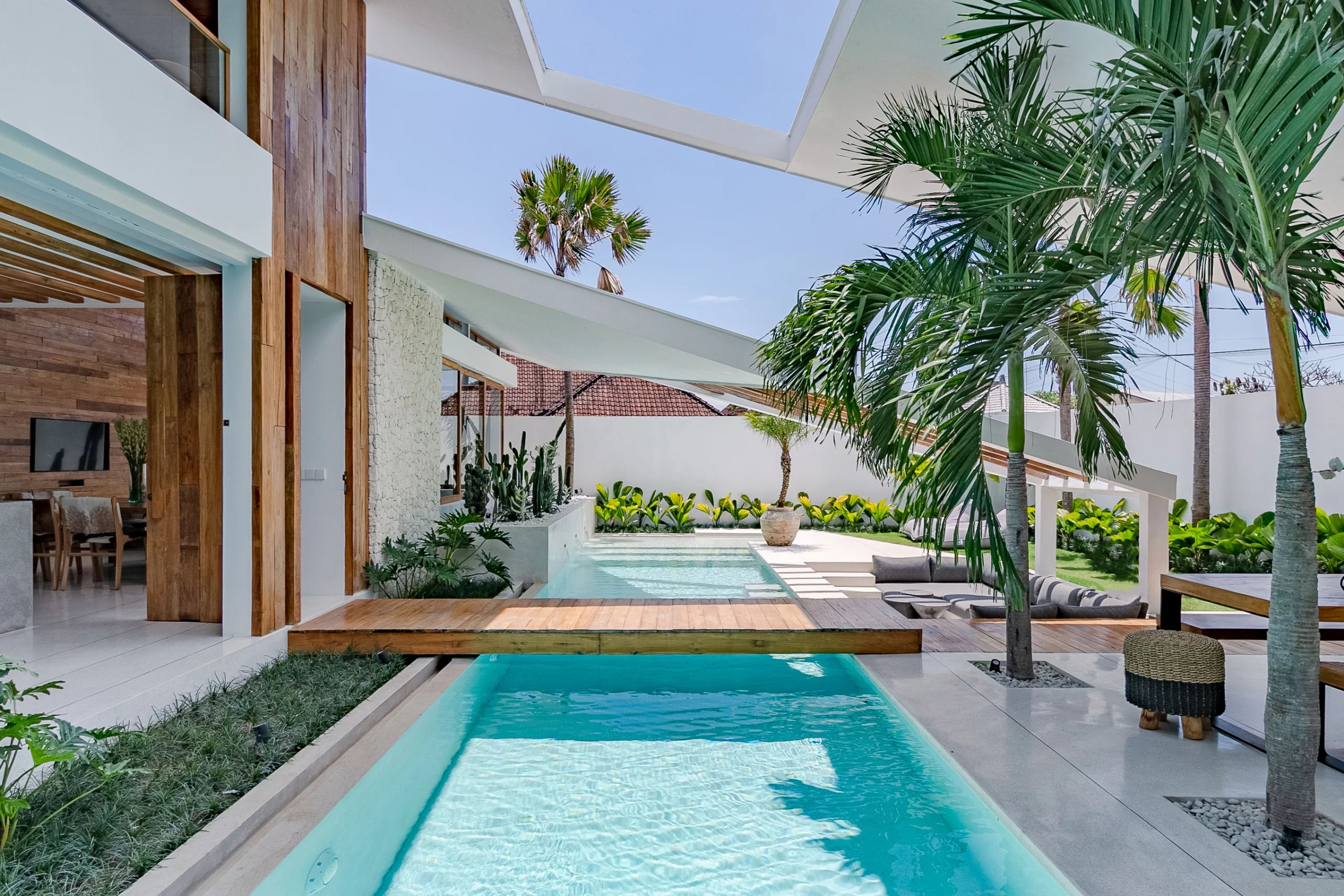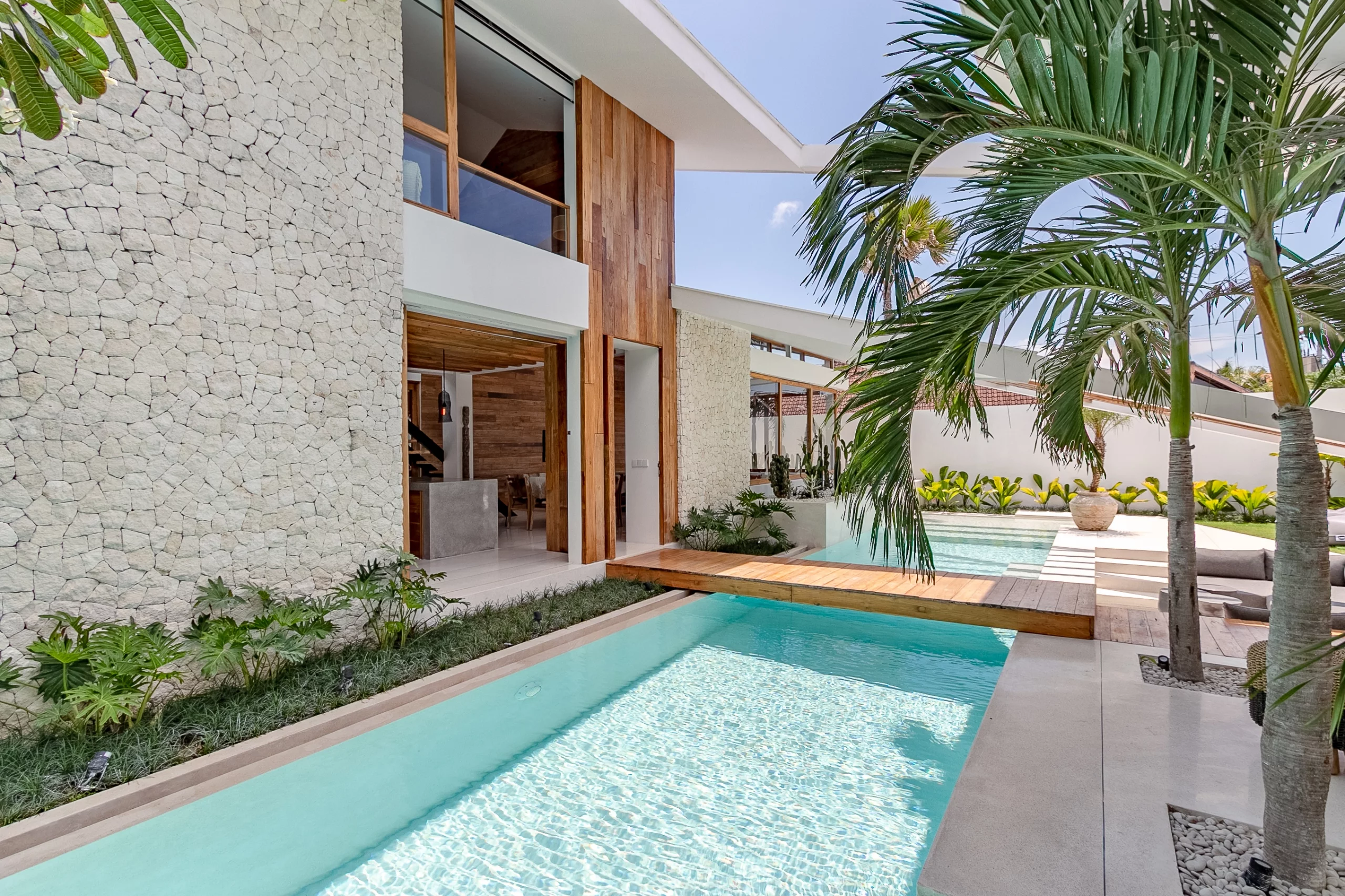 The villa’s design by Biombo Architecture, an esteemed international architecture and design studio. It features a distinctive concept with two interconnected roofs, fostering a unique space that blends natural materials with architectural elements. With a total area of 380 sqm and a building size of 317 sqm, this villa offers ample space. It comprises 4 bedrooms and 5 bathrooms, thoughtfully designed to provide utmost comfort with a modern tropical ambiance.