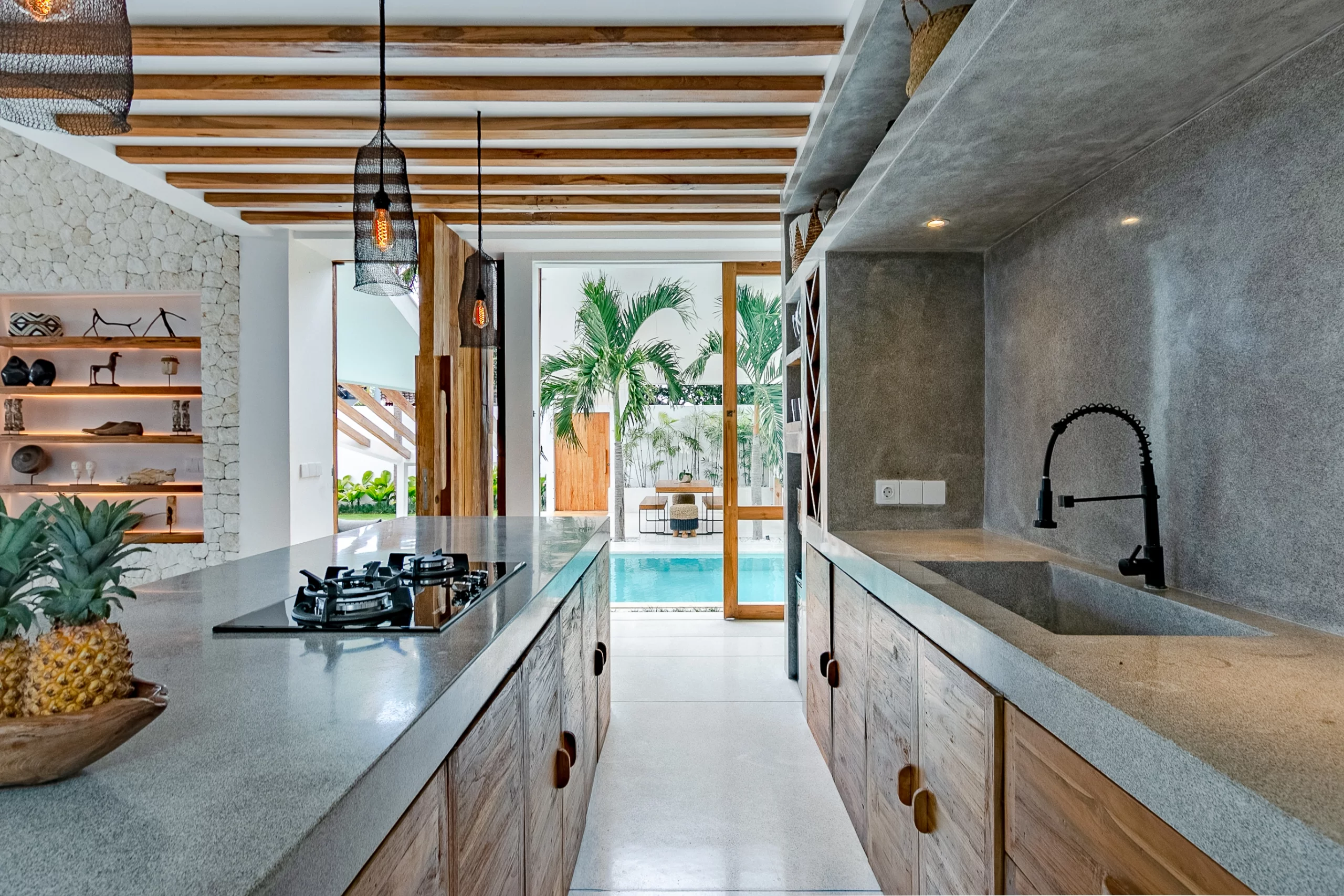 Upon entering, you will be greeted by a stunning outdoor area featuring a pool, sunken sofas, and an outdoor dining room complete with a BBQ. Moving forward, an inviting open bar kitchen and dining room, adorned with wooden accents, leads to a cozy living room area. Large windows allow for an abundance of natural light, creating a harmonious connection with the outdoors.