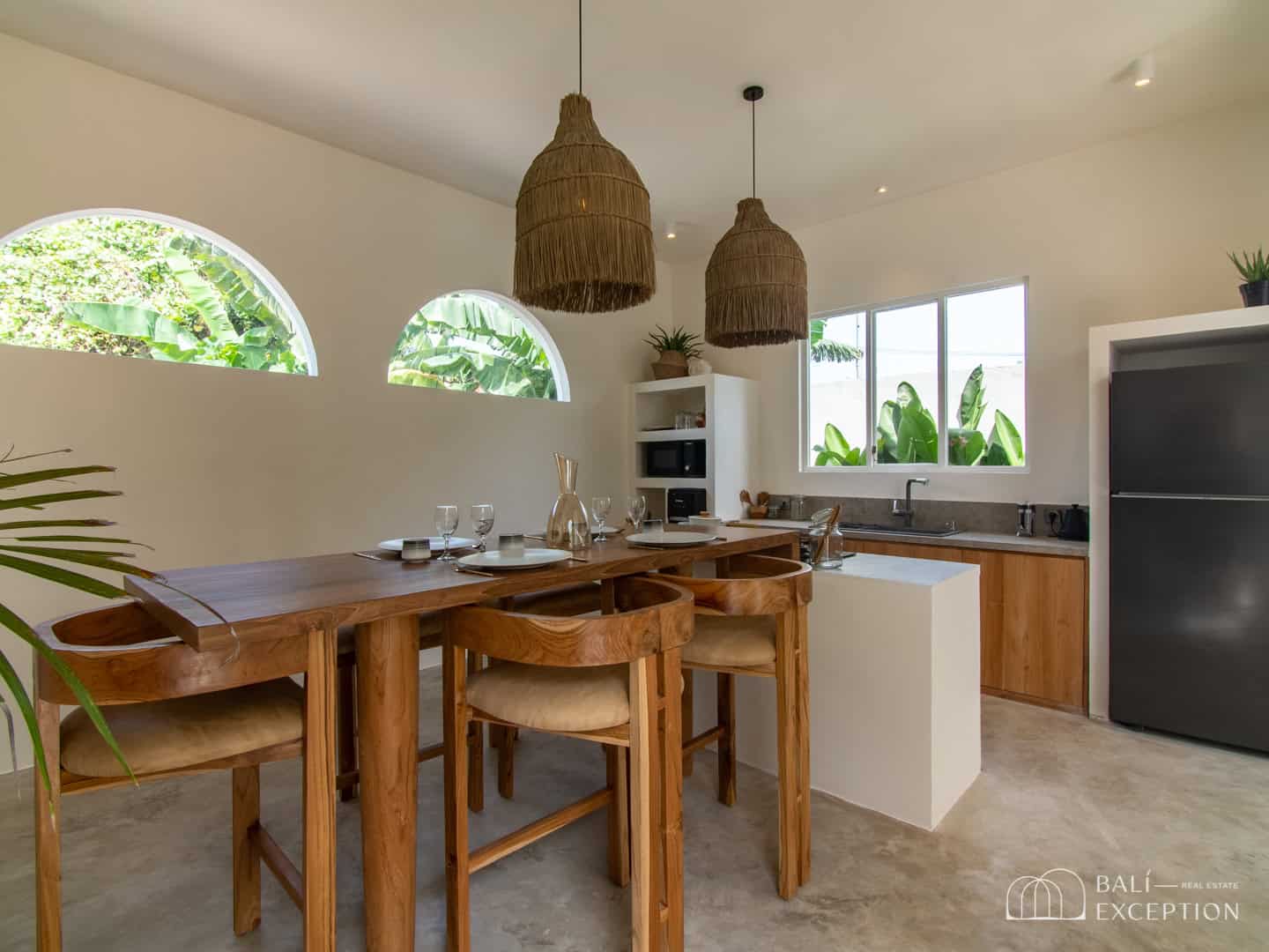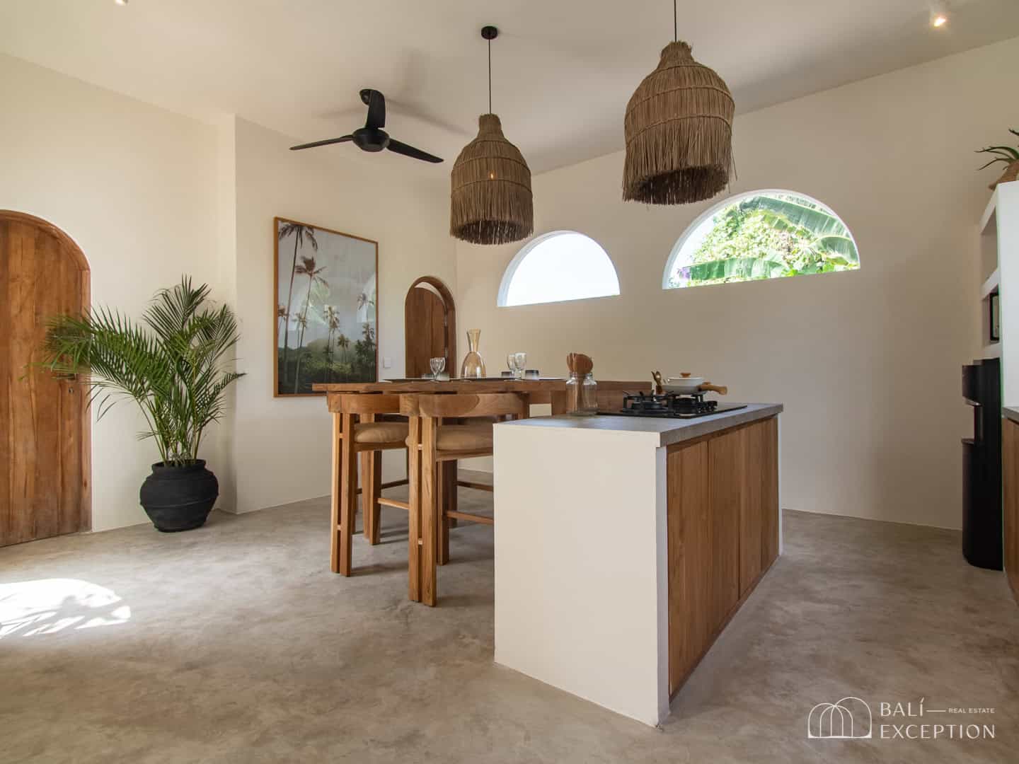 A bright living room with high ceilings, open on the kitchen and dining area, big bedrooms where the digital nomad will find a comfortable desk to work on, an outdoor space to chill around and in the swimming pool.