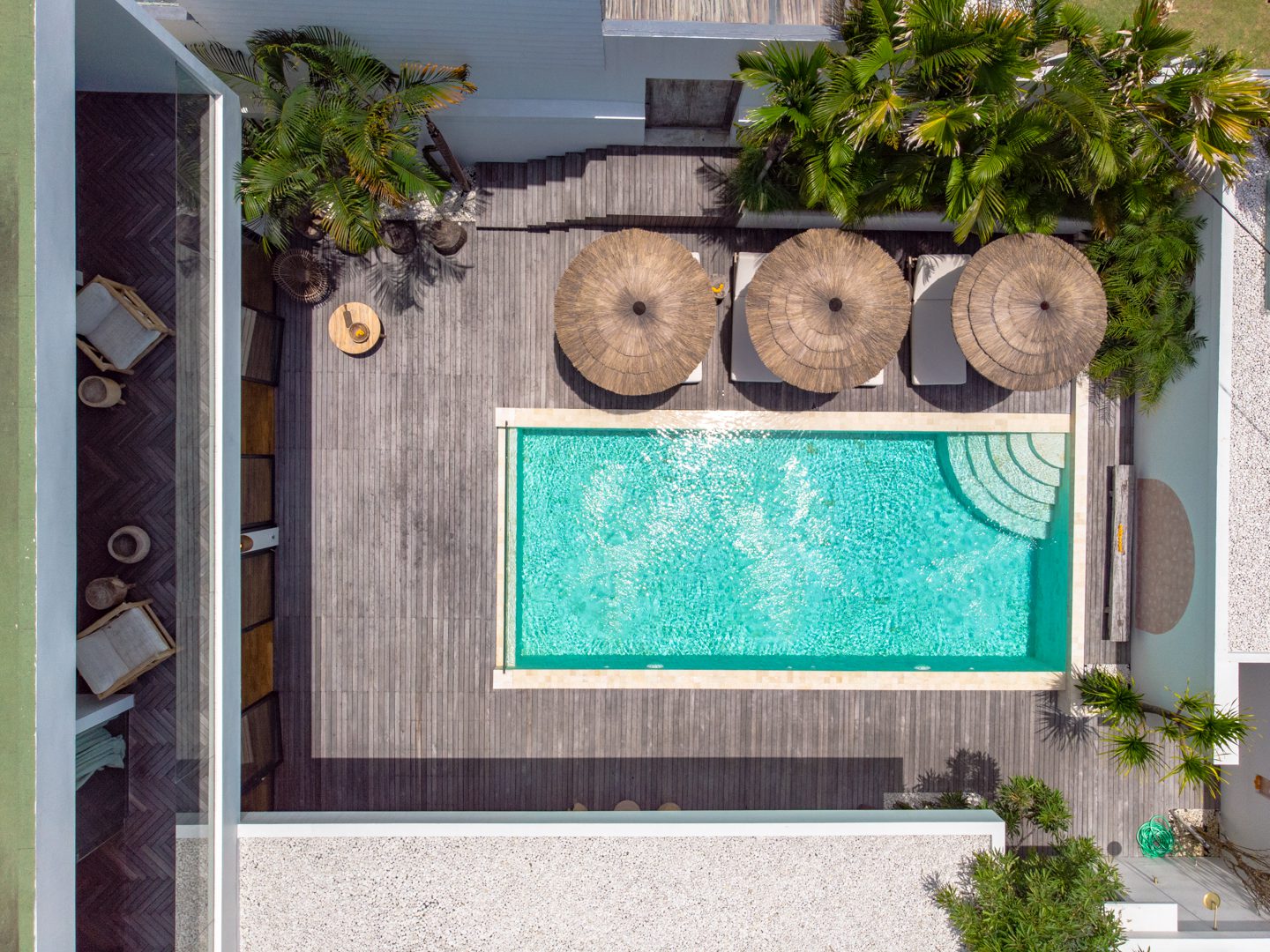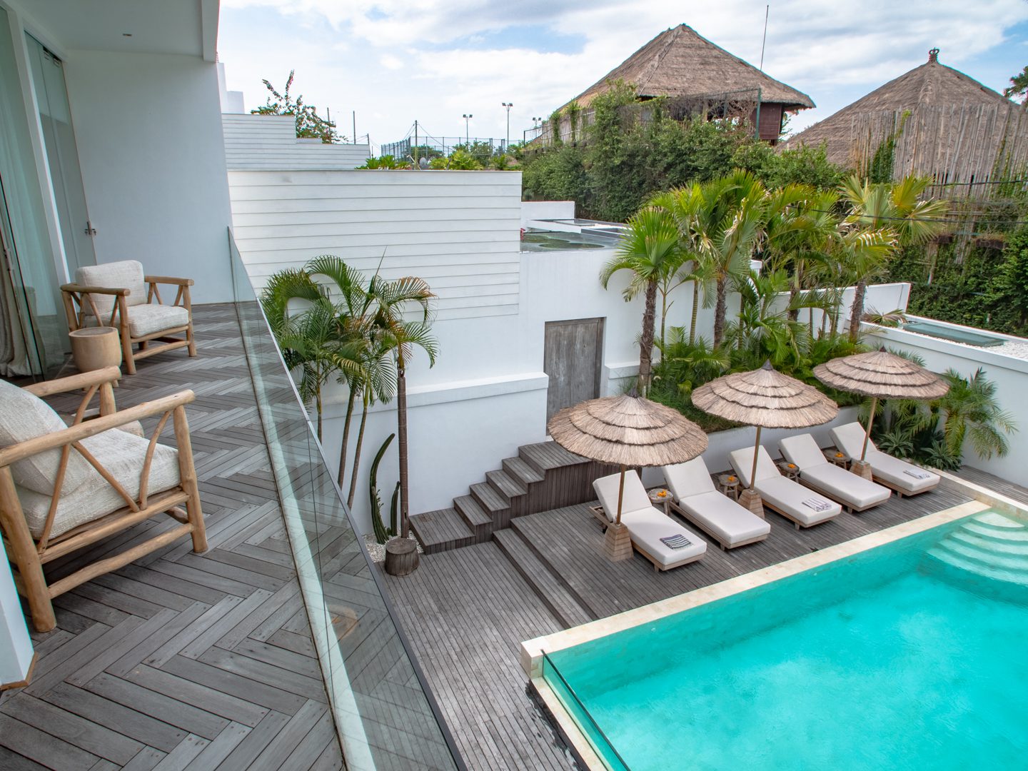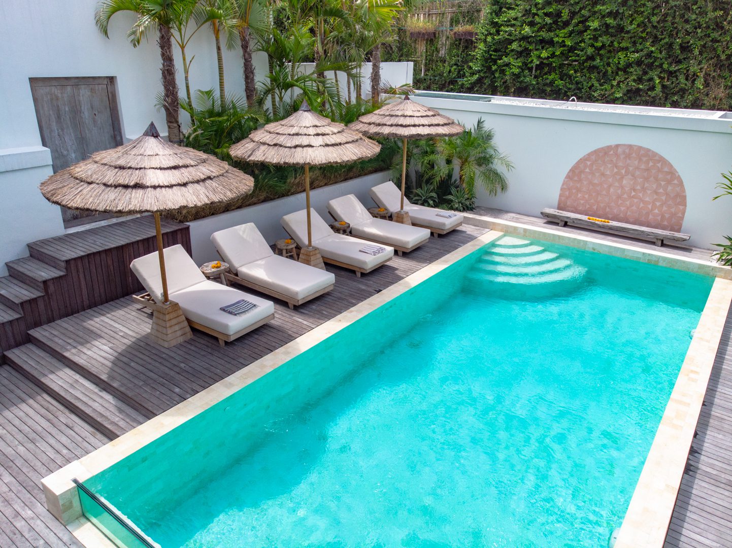 The outdoor space includes a beautiful designer pool and places to enjoy the sunshine and relax with your friends.