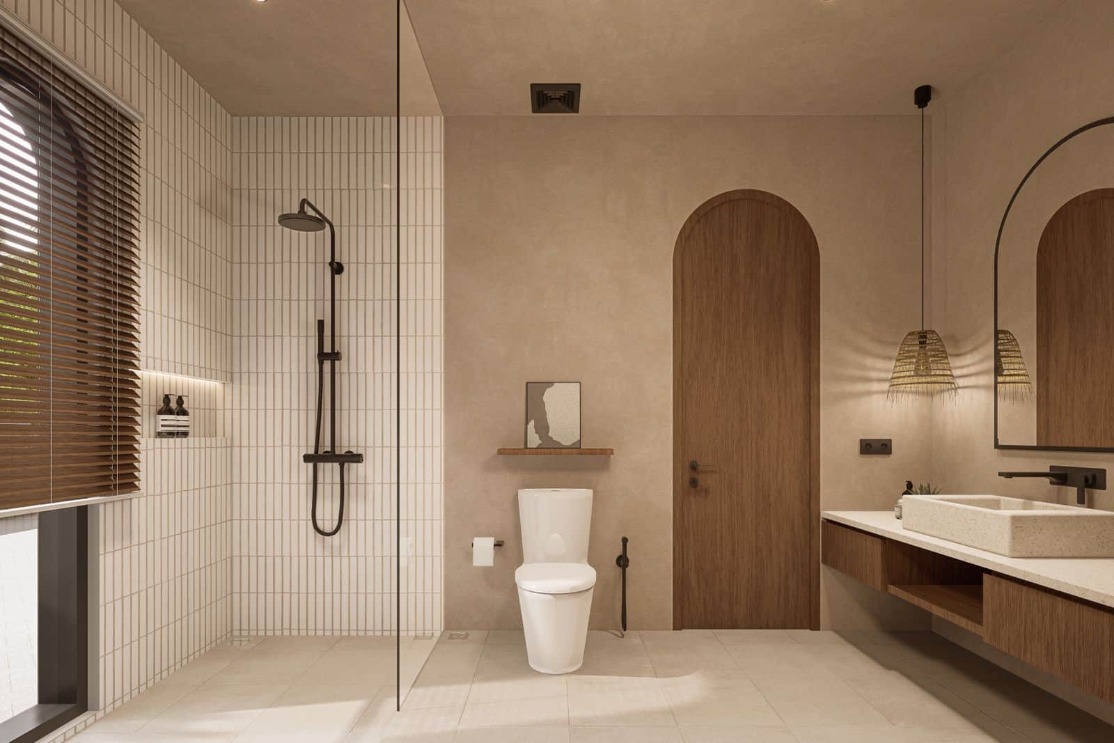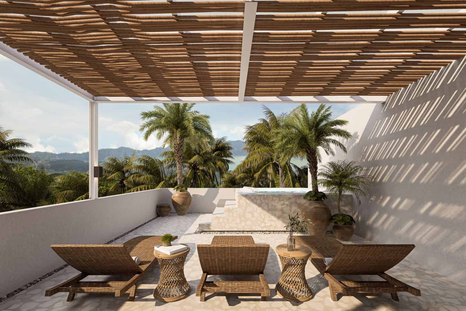 This villa features a 2-bedroom with ensuite bathrooms. Fully furnished with modern tropical décor, it includes a fully equipped kitchen for home cooking. The sunken living room, complemented by high ceilings and expansive windows, creates a spacious and airy atmosphere.