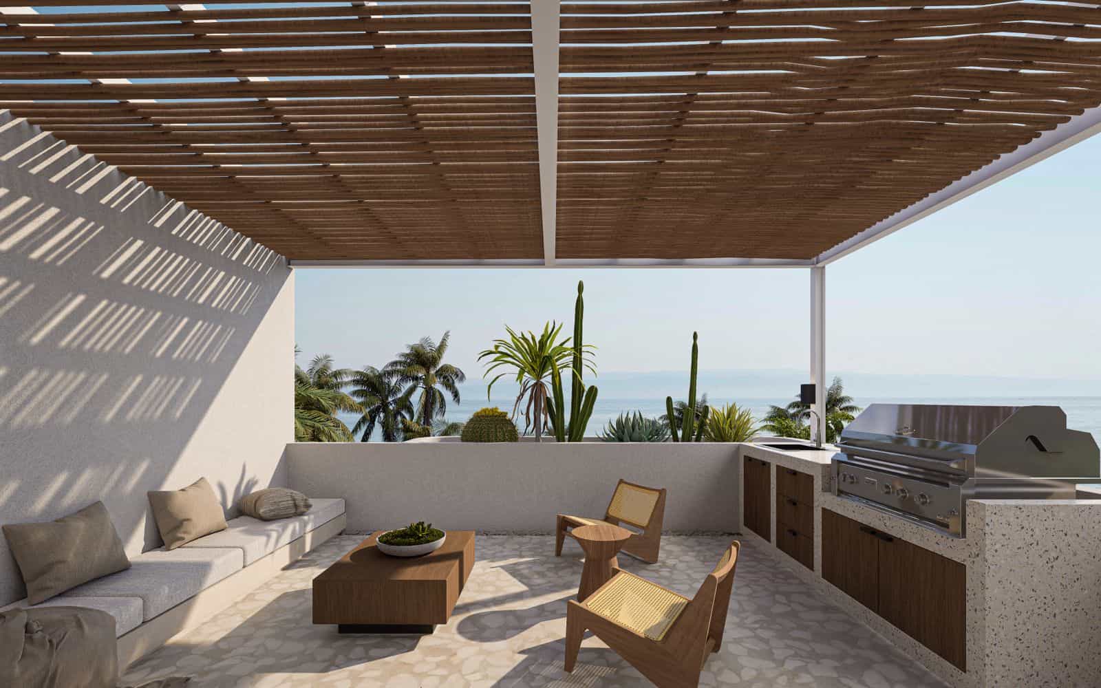 Modern patio with pool, plants, and outdoor seating