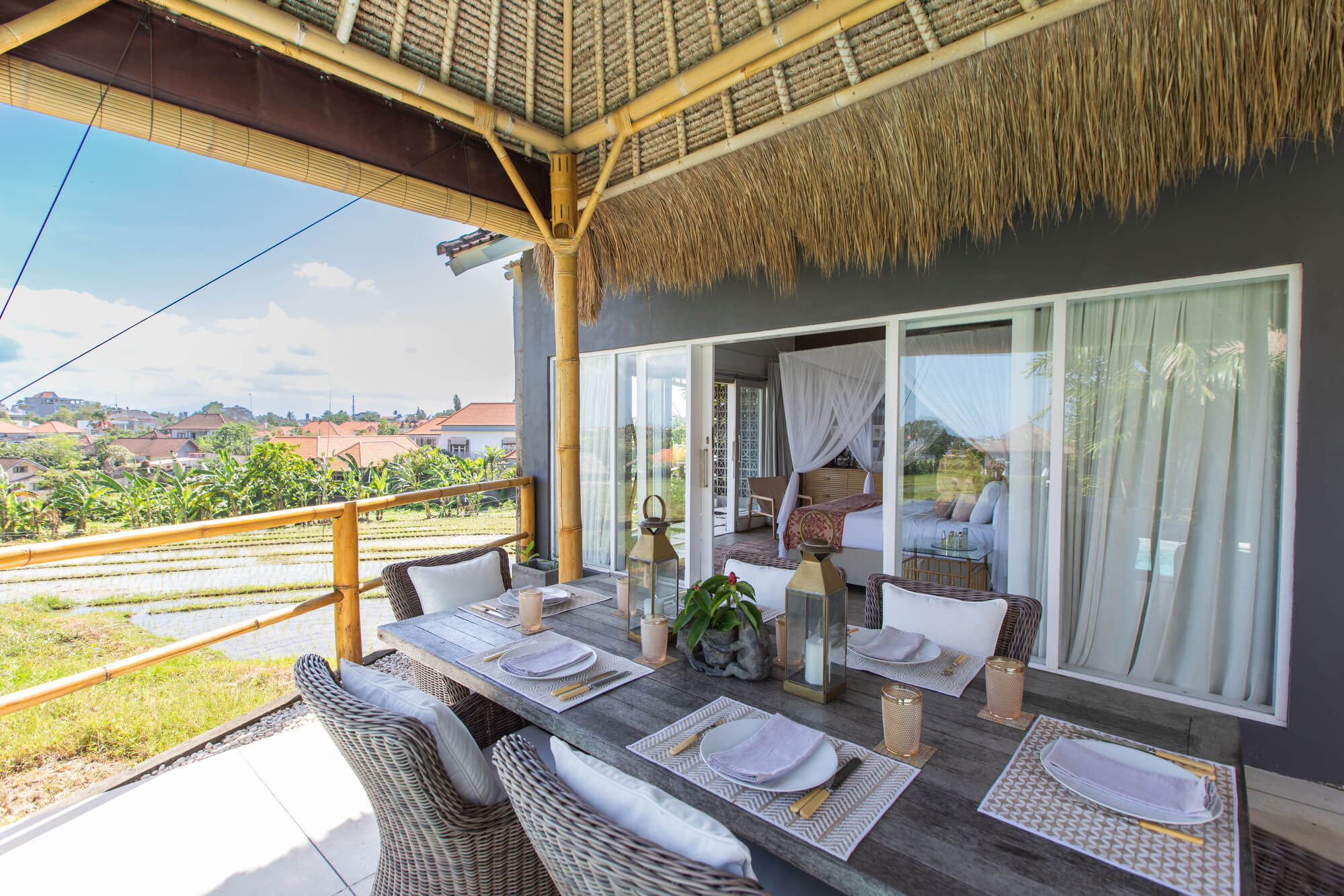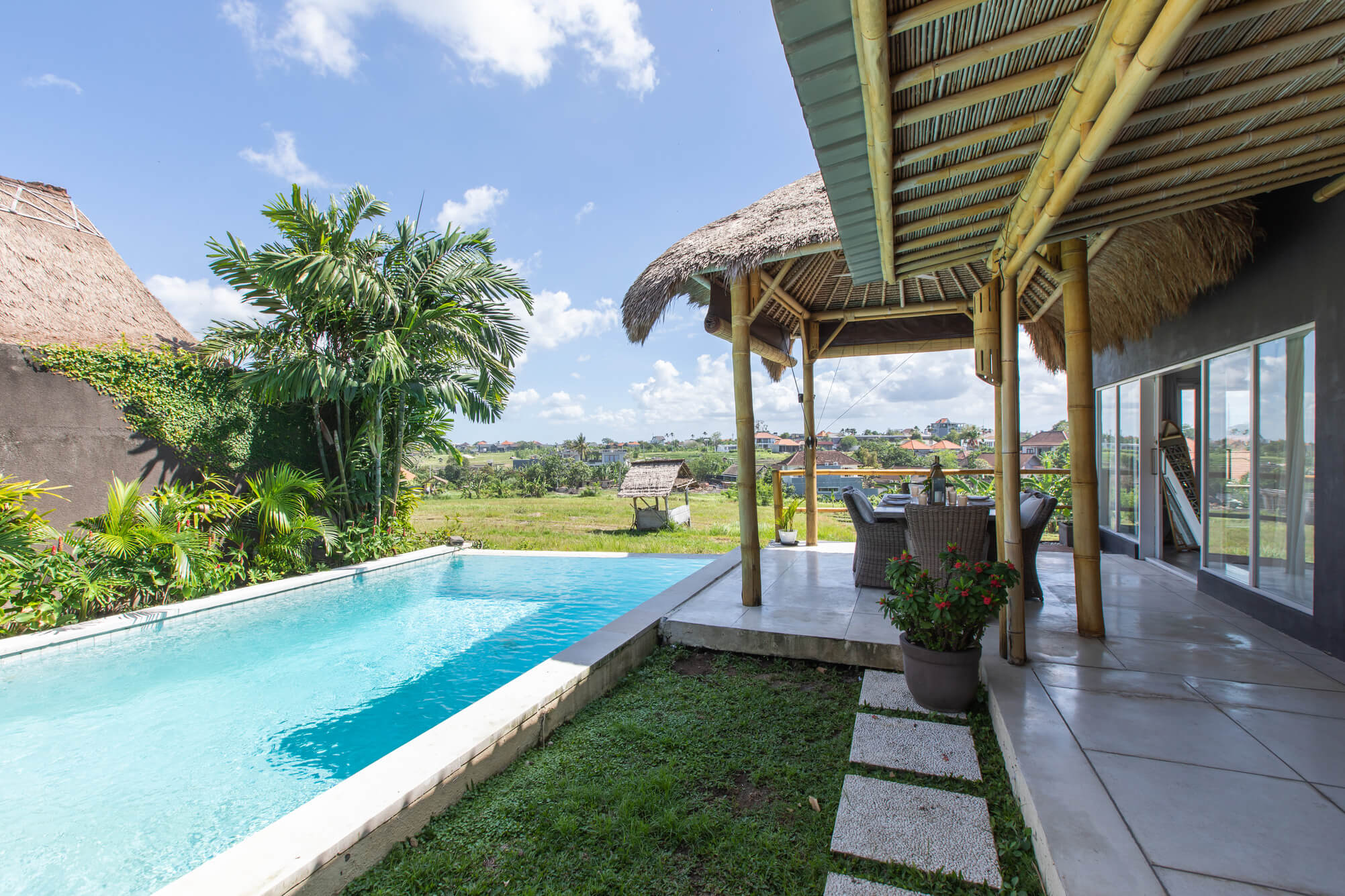 One of the highlights of the villa is the infinity pool, which comes complete with poolside lounge chairs. This inviting space encourages you to relax, unwind, and soak up the tropical sun while gazing out upon the stunning rice fields.