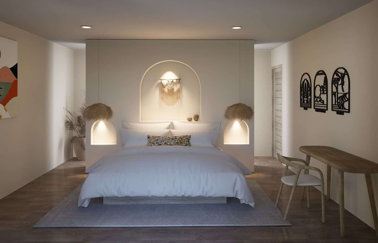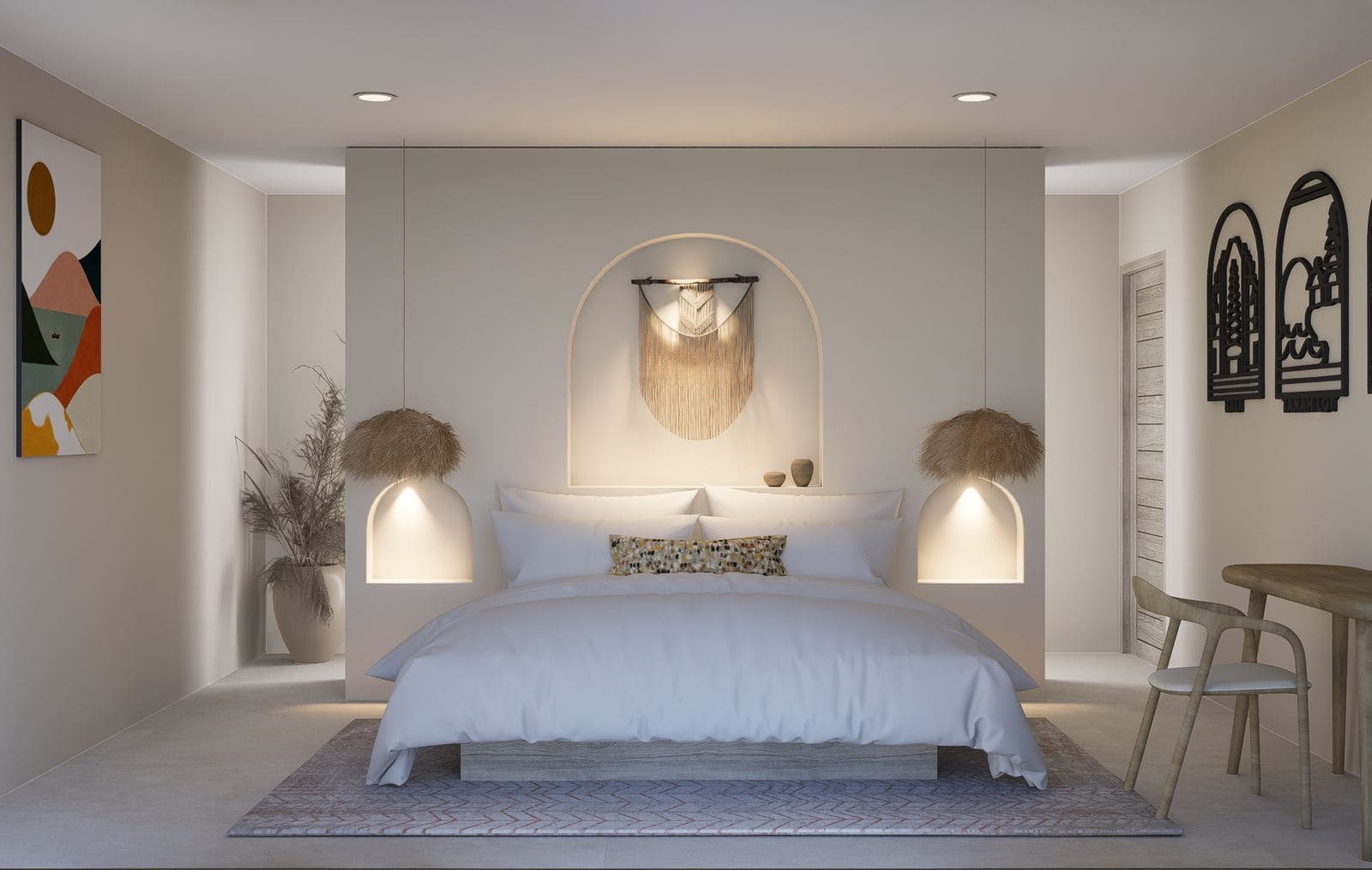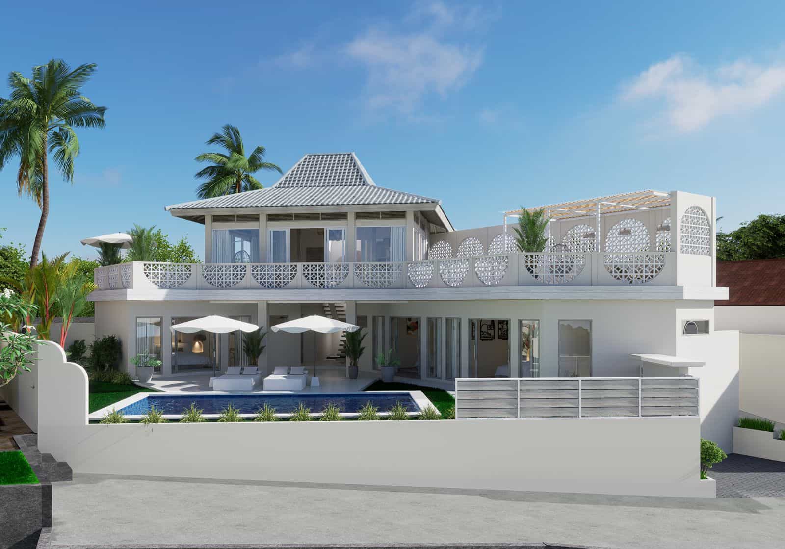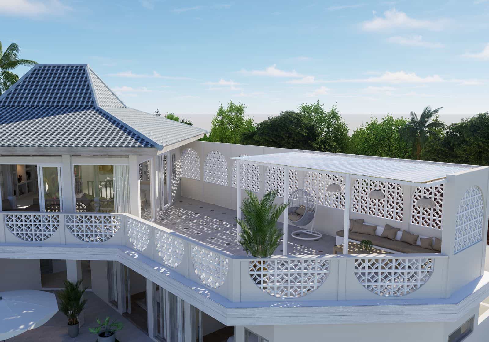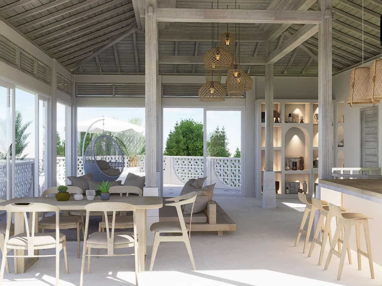 Outside, the villa’s amenities include a pool with sunbeds, a rooftop cabana lounge area, and a hanging chair, perfect for relaxing and enjoying the beautiful surroundings.Â