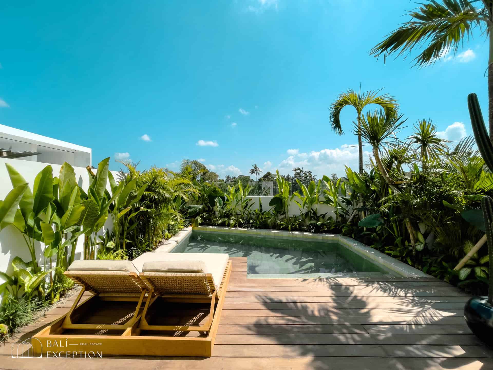 The outdoor oasis of the villa features a pool surrounded by lush greenery, complete with a sofa area for relaxation, creating a feeling of being in a tropical paradise. This villa is a true gem, a perfect fusion of modern luxury and warmth.