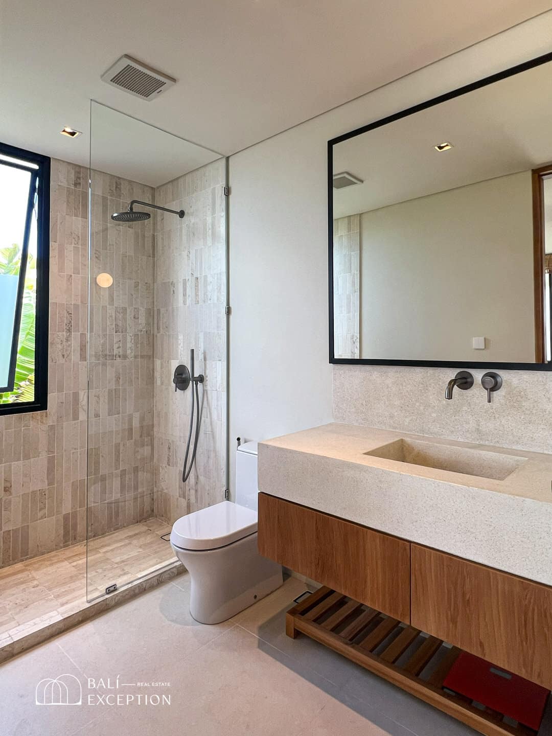 The villa boasts one bedroom that includes an ensuite bathroom. Additionally, there is a guest toilet for convenience. The villa is fully furnished with tasteful decor.
