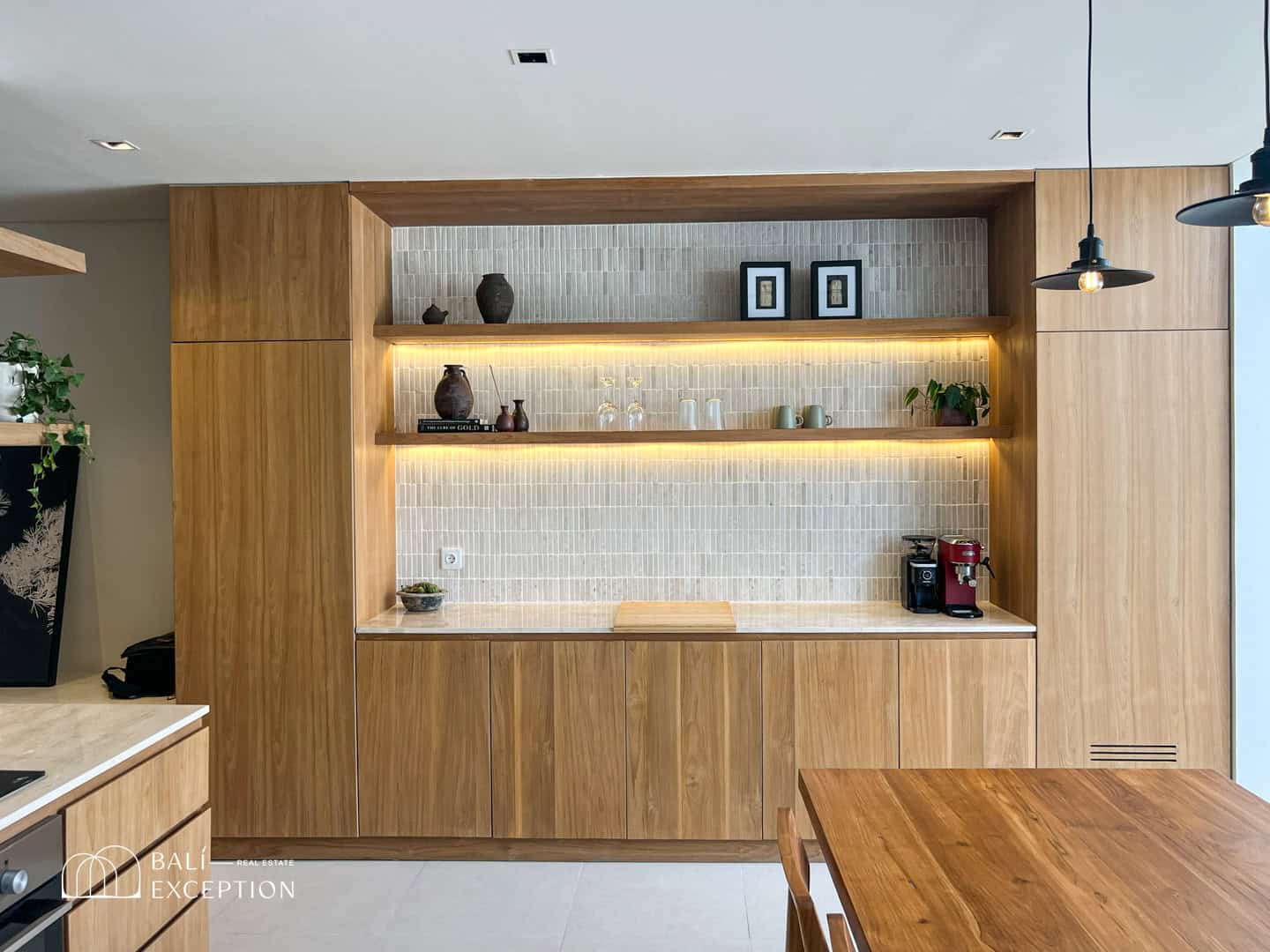 The fully equipped kitchen offers all the needed for culinary creativity. It features high-quality materials, including solid wood cabinetry and marble countertops, adding a touch of luxury and durability to the space.