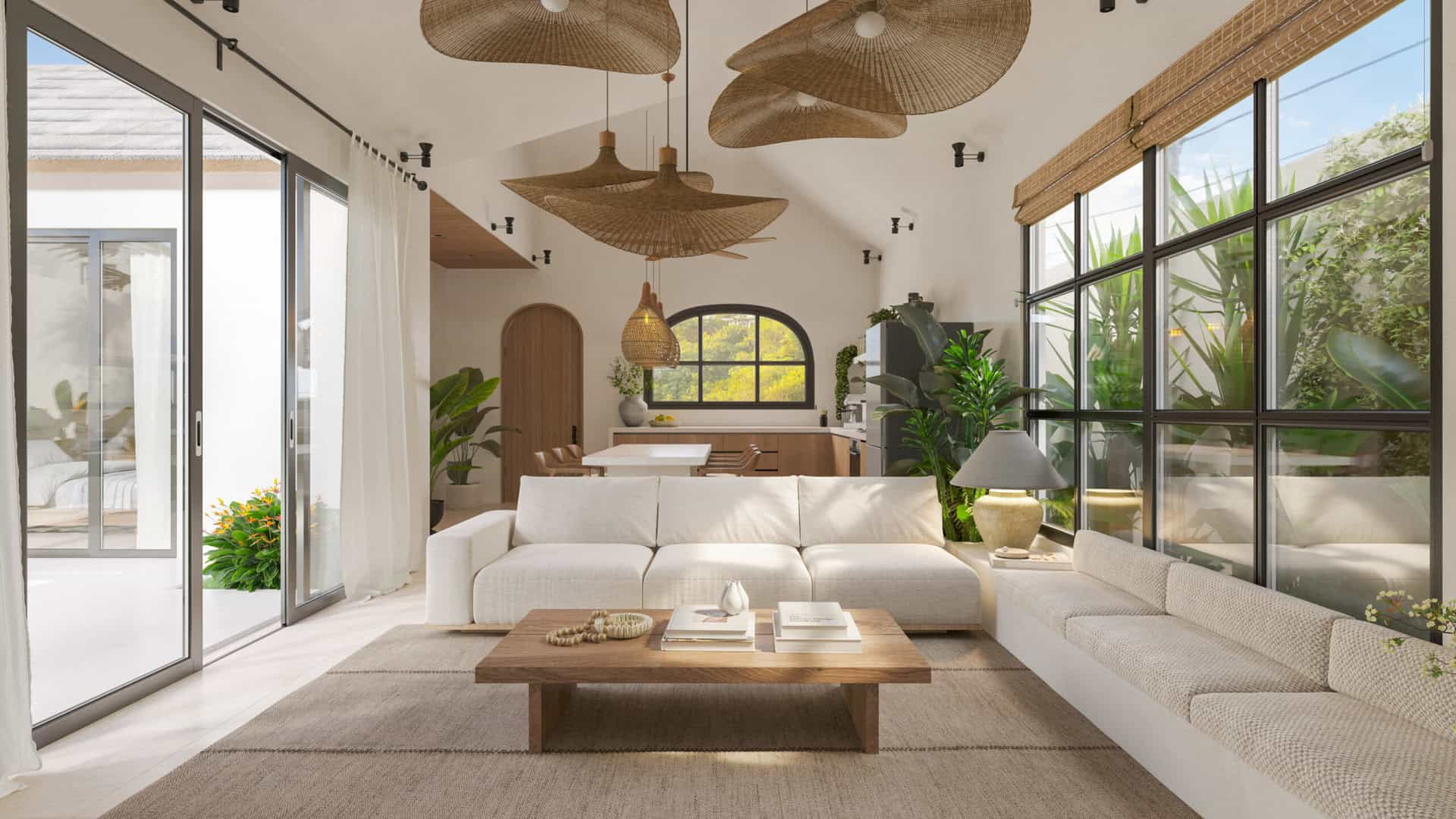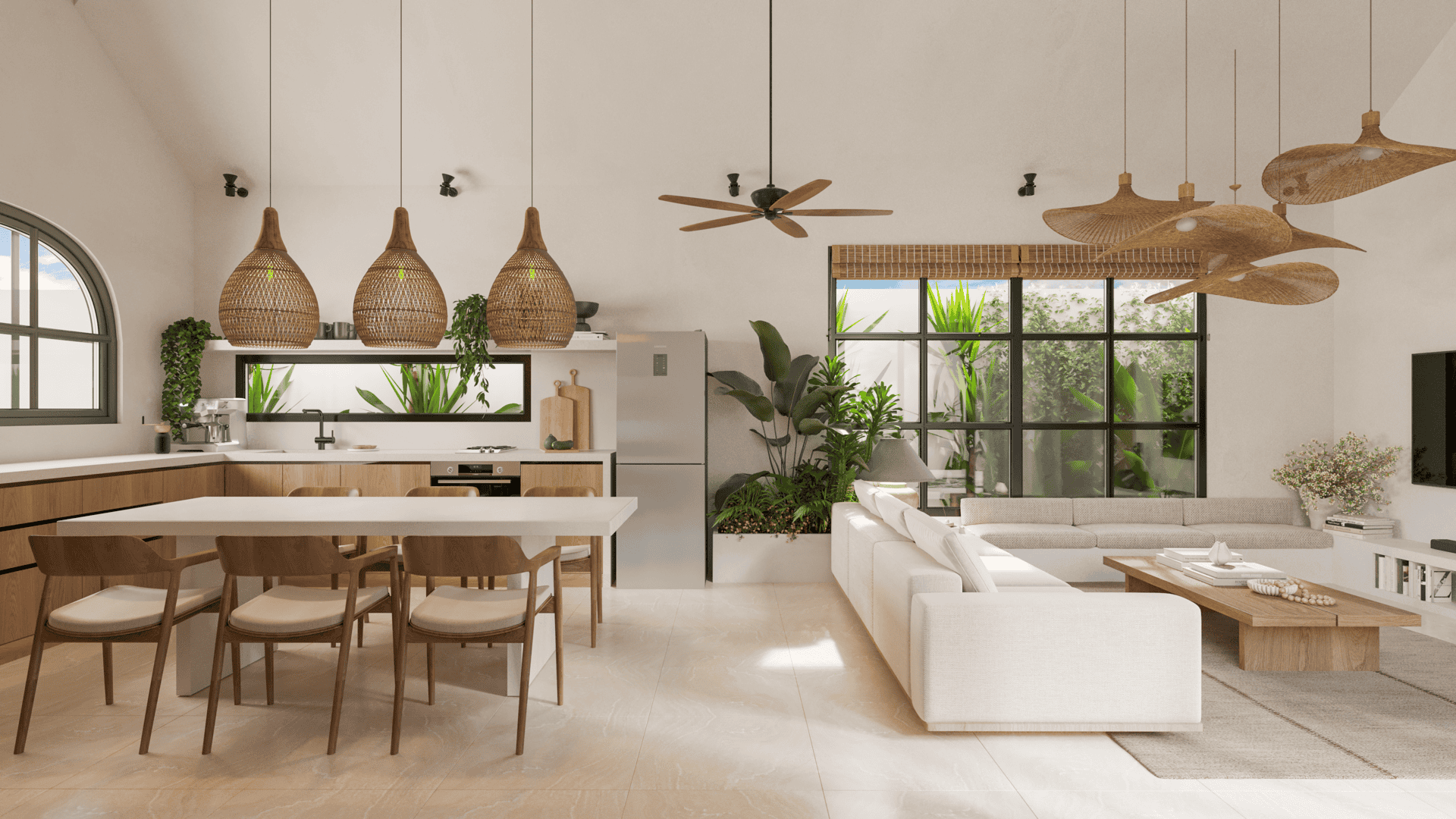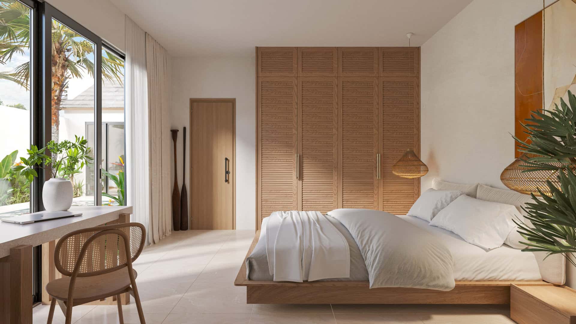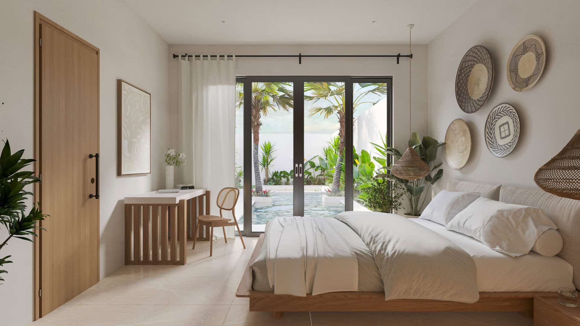The villa, which features two bedrooms with poolside views and ensuite bathrooms, is designed for both relaxation and functionality. Comes fully furnished, the living room features a high ceiling and expansive windows, allowing natural light to flood the space. The fully equipped kitchen provides everything needed to prepare meals and entertain guests.