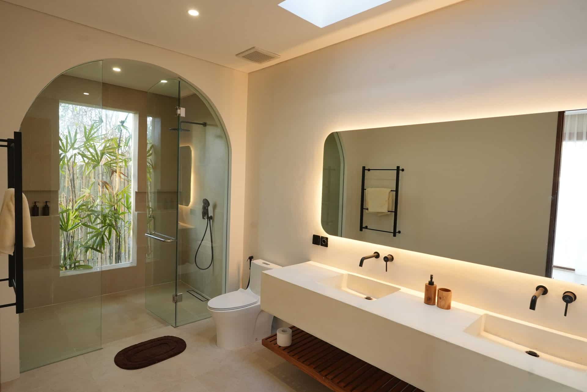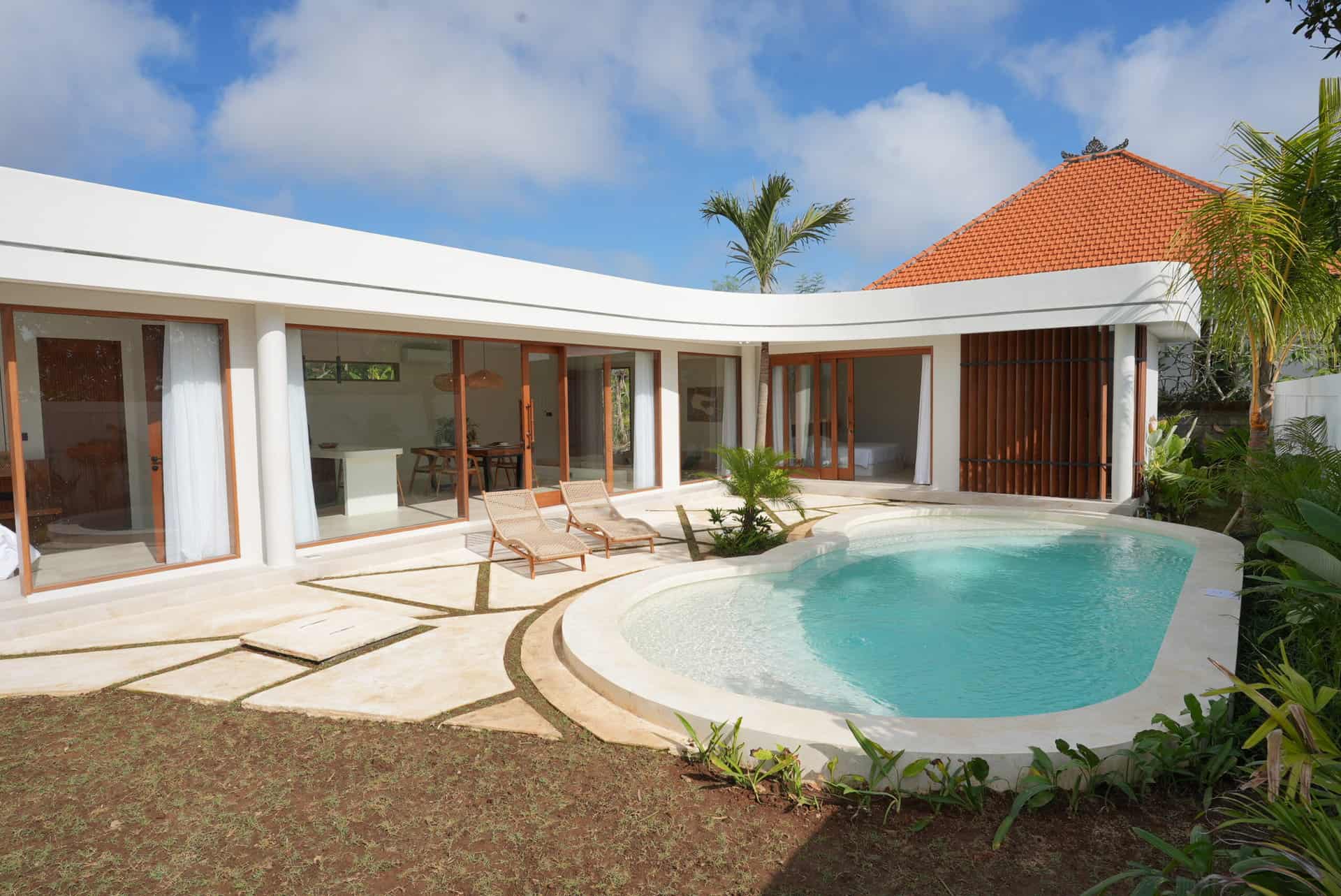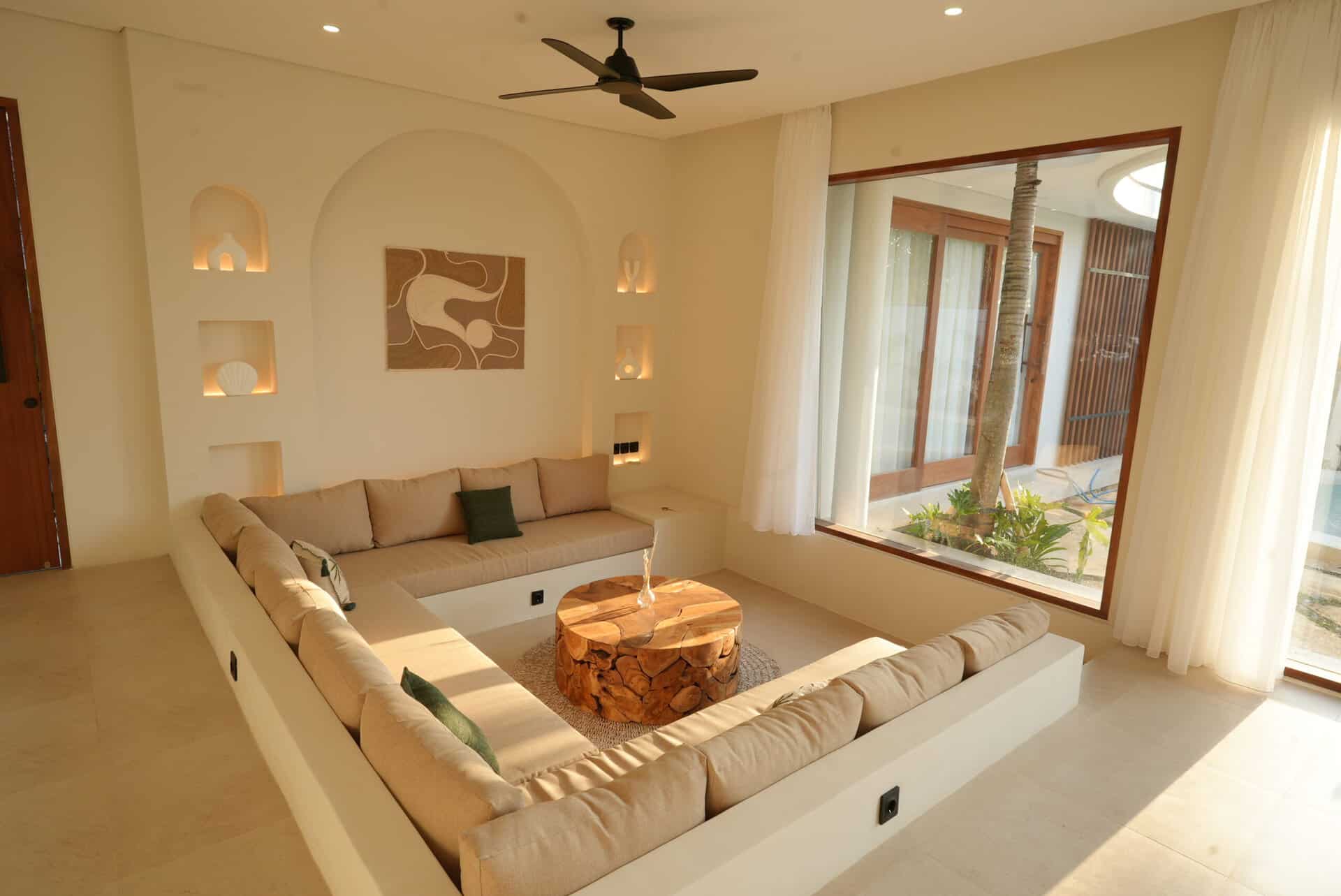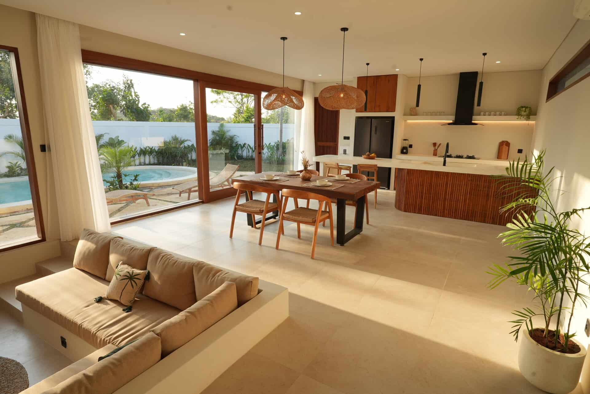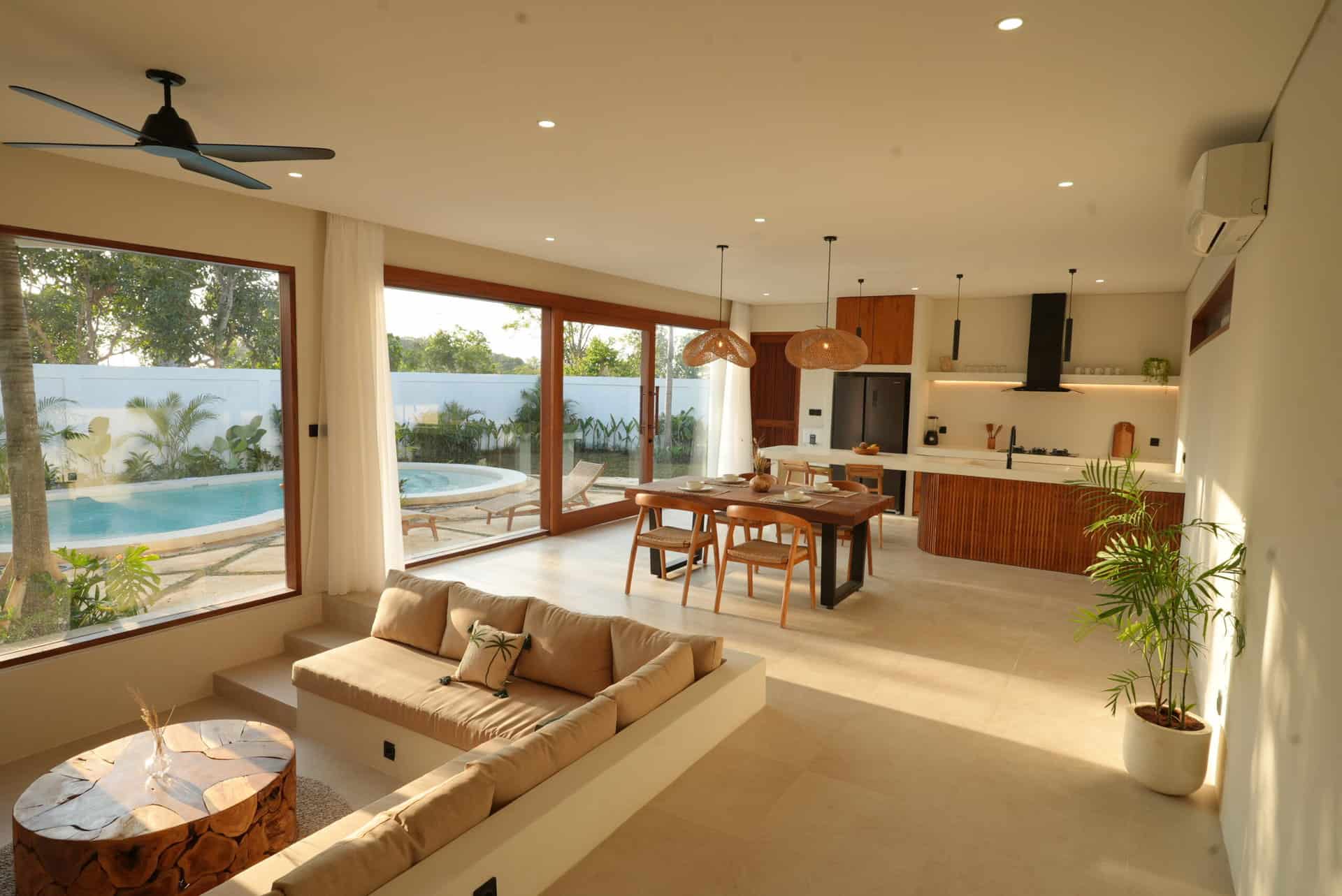 This single villa offers enhanced privacy, features sunken seating, living room and high ceiling windows that create a spacious and airy atmosphere. It includes two bedrooms, each with its own ensuite bathroom, and is fully furnished with modern and tropical decor. The fully equipped kitchen is ideal for preparing meals at home.