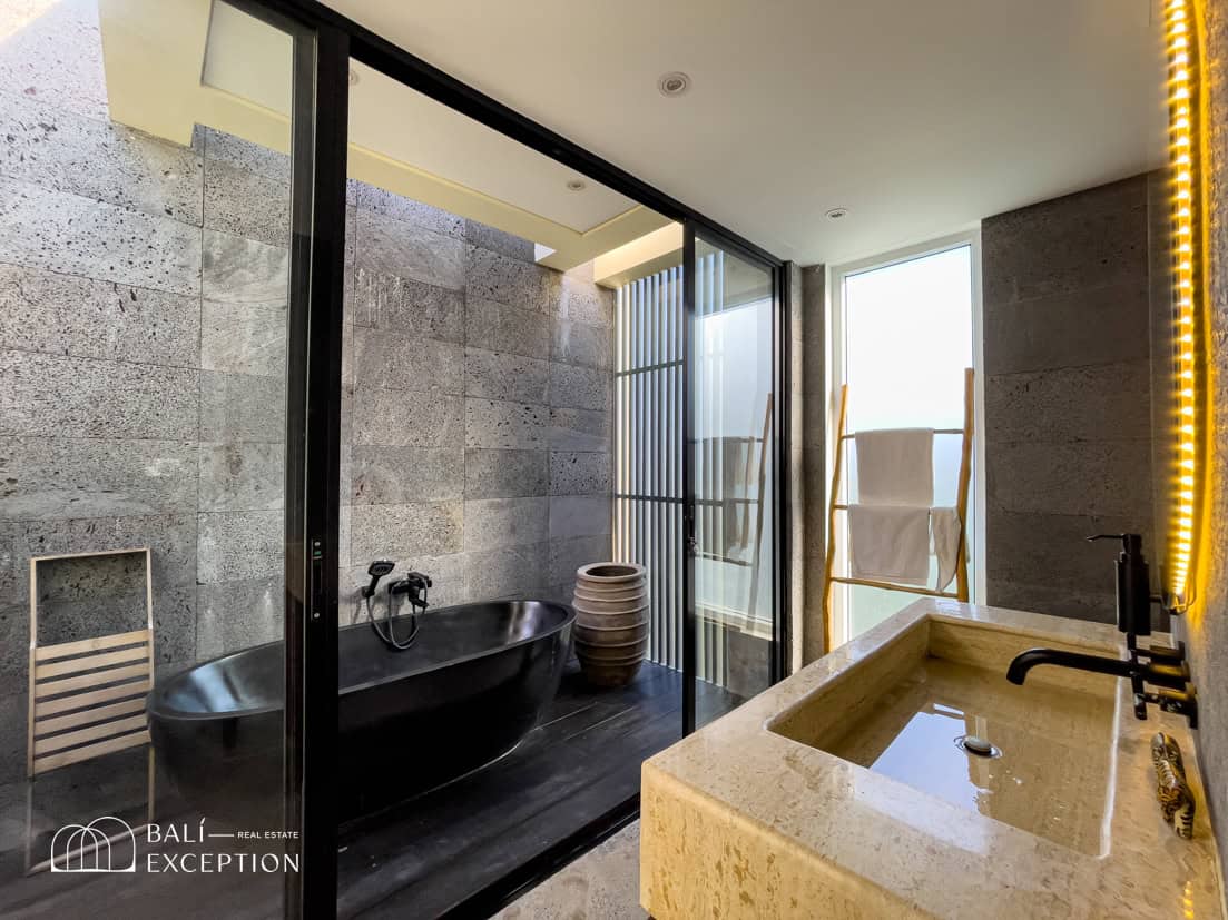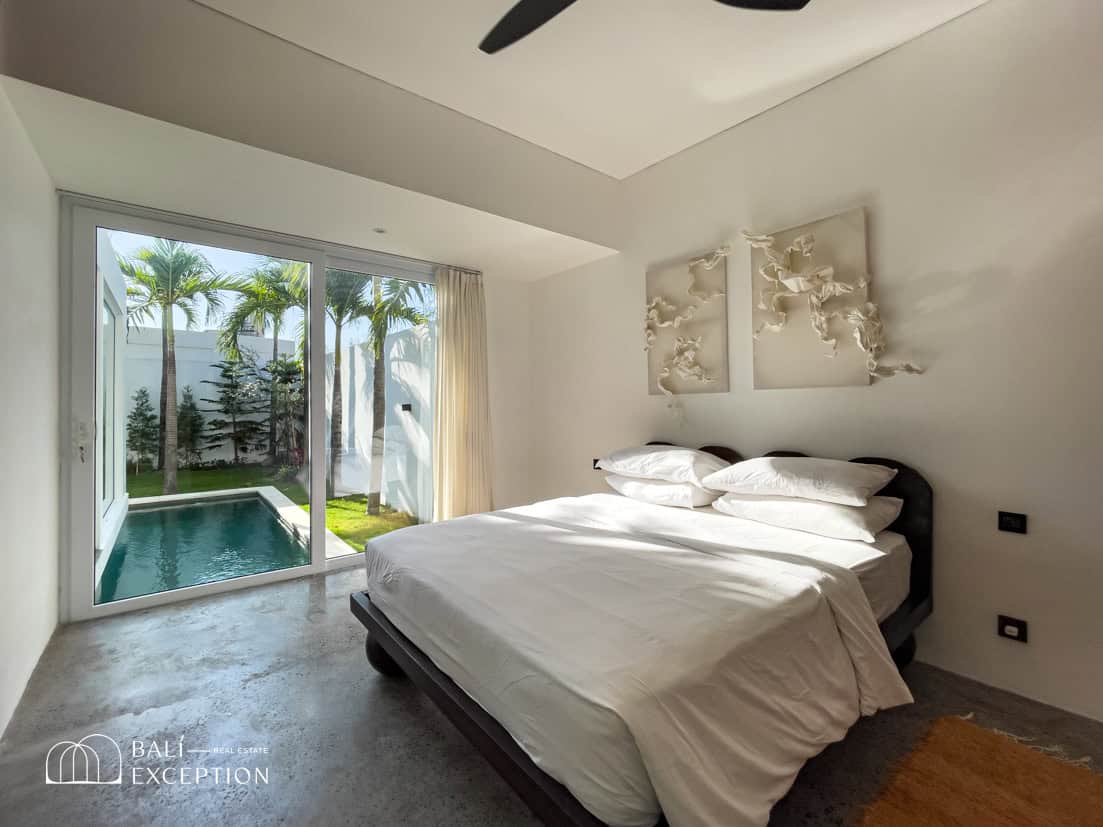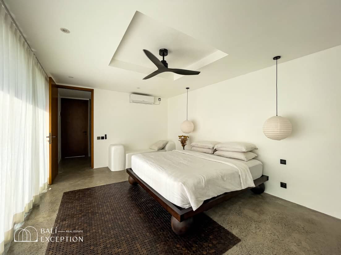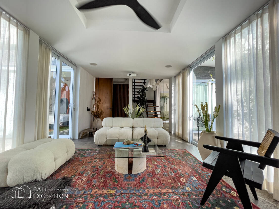 Ready for you to move in, this two-level villa offers three bedrooms, with its own ensuite bathroom. The master bedroom boasts a bathtub. A standout feature is the floating living room that extends over the pool, creating a seamless blend of indoor and outdoor living. The villa’s unique design is complemented by high-quality furniture and high ceiling windows that enhance the airy, open atmosphere of the home.